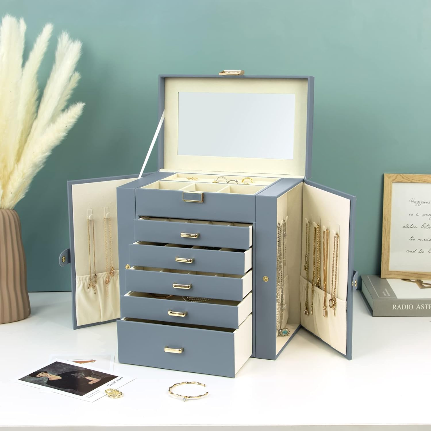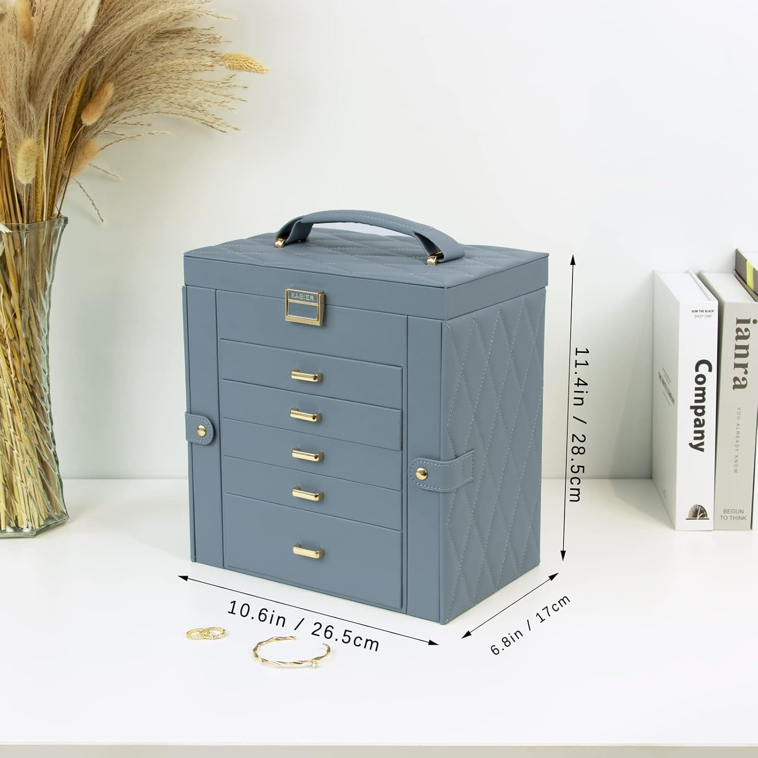 Jewelry Box for Women, 6-Layer Large Jewelry Organizer Box with Mirror & 5 Drawers for Rings, Earrings, Necklaces, Bracelets,Bluish Grey Leather + Velvet lining 【ELEGANT COLOR MATCHING】Senior Bluish Grey PU leather with High-end Handmade stiching line , add a stylish touch to your room. At the same time , it could storage kinds of jewelrys and make your dressing table be more cleaner. This mirrored jewelry box comes with a built-in large mirror on top lid, makes it easier for you to dress up. 【MULTIFUNCTION & LARGE CAPACITY】It could make sure your fine jewelry have enough storage space , cause this jewelry case have 6 layers and 5 multifunction drawers . KAMIER Jewelry organizer with Mirror on Top , and it have 2 Hidden Side Cabinets , each side have 8 stronge hooks , to make sure they will not mix and sturdy to hold heavy jewelry .You can DIY it , just need remove all the dividers , customize the partition according to your personal habits and preferences .It could used for a small to medium jewelry collection , if you're a jewel lover. 【PREMIUM MATERIALS】 Sturdy Jewelry organizer made from wood , covering elegant PU leather , it makes your box more durable and easy to clean , you can wipe it off effortlessly with a damp cloth . Interior used softy velvet , to protect your fine jewelry very well.It keeps you in a good mood . 【Space Saving And Tidy】The jewelry storage box measures 10.5L*6.5W*11H inch (26.5cm*16.5cm*29cm). It is equipped with a delicate metal buckle for easy opening and closing, It can store all your Jewelry, beautifully placed on your dresser, bedside table, bathroom counter or dresser, saves a lot of space and makes your dresser and room look neater. 【Ideal Gift for Women】The new jewelry organizer is elegant, classic and beautiful in appearance, with great use value. Whether you are treating yourself or giving a gift to your girlfriend, wife, mother or other loves, this jewelry storage box makes for a wonderful gift to someone special in your life. It will be packaged in an elegant bag, suitable for gift giving and jewelry collection. If you have any questions, please contact us via email,we are happy to assist you. KAMIER Add to Cart Add to Cart Add to Cart Customer Reviews 4.6 out of 5 stars 596 4.7 out of 5 stars 2,285 4.7 out of 5 stars 544 4.5 out of 5 stars 1,018 4.6 out of 5 stars 1,182 Price $58.99 $ 58 . 99 $32.99 $ 32 . 99 $30.99 $ 30 . 99 — — Mirror ✔ ✔ ✘ ✘ ✘ Color Black, White, Grey,Bluish Grey Black, White, Grey, Blue, Pink Grey,Beige Black, White, Grey, Blue, Pink Black, White, Grey, Blue, Pink Lock ✓ ✓ NO ✓ ✓ Dimension 10.5*6.5*11 in 8.6*6.5*4.5 in 9.3*5.5*6.5 in 6.4*4.4*2.7 in 4.7*4.1*2.4 in Occasion Home & Living Home & Living Home & Living Travel Travel https://autods-scraper-images.s3-us-west-2.amazonaws.com/03e5020e5996beed1787c59d5f1c1d81.png