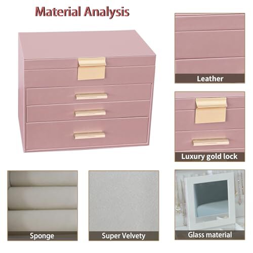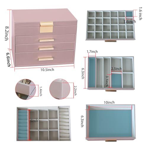Return Policy Fast Delivery Trusted seller 4 Layer Jewelry Box for Women, Jewelry Organizer Box with Necklace Hooks, 3 Drawers Jewelry Box for Sunglasses, Necklace and Bracelet Storage (Rose Gold, 4 Layer) Product Description 4 Layer Large Jewelry Box : The first layer of the box has 2 ring lines, 1 mirror , 11 necklace hooks and 9 earrings grids. The mirror is perfect for your daily makeup. Earrings Holder Organizer Box: The first drawer has 24 earrings slots for earrings and Christmas charms organizing. The Second drawer had 3 long grids for your watches, link-chains and necklace organizing, while 4 bracelets grids for your bangles, cuffs and bracelet storage. Sunglasses and Big Stuff Organizer: The Bottom Large Drawer is perfect for your accessories such as sunglasses, lipsticks and watches storage. Space and Time Saving for Makeup Table: With our 4 layer jewelry box, all your jewelry will be in good order and easy to reach. From then on, you have a bright dresser that saves space and makes your room look neater and more elegant. In addition, our jewelry travel boxes are designed to categorize your jewelry at a glance, shorten search time. Ideal Jewelry Gift Box : This PU leather jewelry box looks elegant and thoughtful. It is a perfect gifts for yourself, your friends, your wife or your mother for birthdays, Christmas, Valentine's Day, Mother's Day and anniversaries. This jewelry holder can be used not only as a girl's jewelry box, ring storage box, necklace storage box, earrings storage box, but also as a gift box for bracelets. Shipping Returns Payment Shipping Shipping is FREE to all addresses other than APO/PO boxes in the lower 48 states. All our stock ships from US-based warehouses. Shipped via USPS or UPS (depending on location and package weight) Unless stated otherwise, all orders will ship within 24-72 hours of your payment being processed. Check our feedback to see the great reviews of FAST shipping we offer. Returns Seller does not accept returns Payment We currently accept payment via eBay managed payments only. Once payment is cleared, we will dispatch your shipment within 1-3 business days. Please refer to the "Shipping" tab for more information regarding shipping speed to your destination.