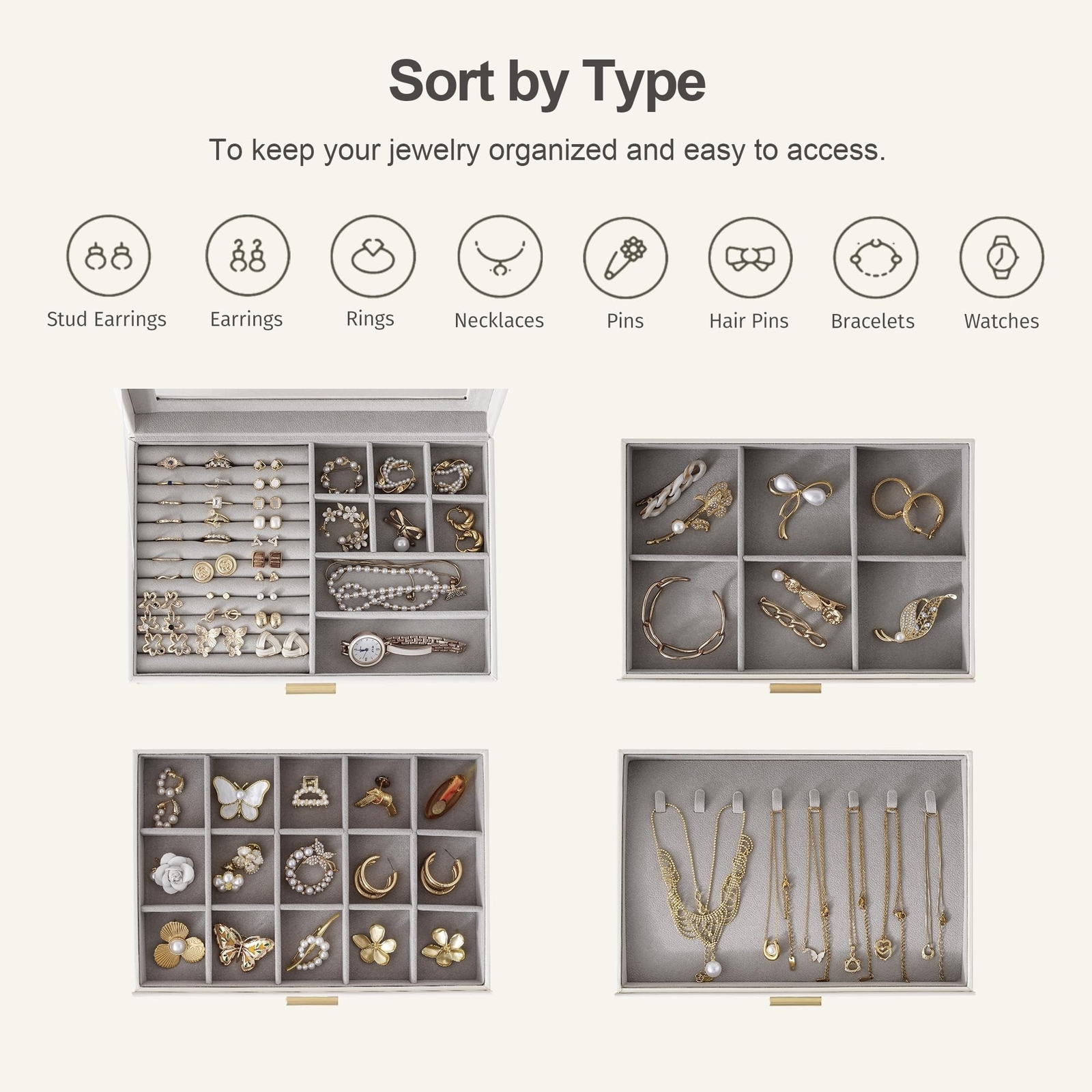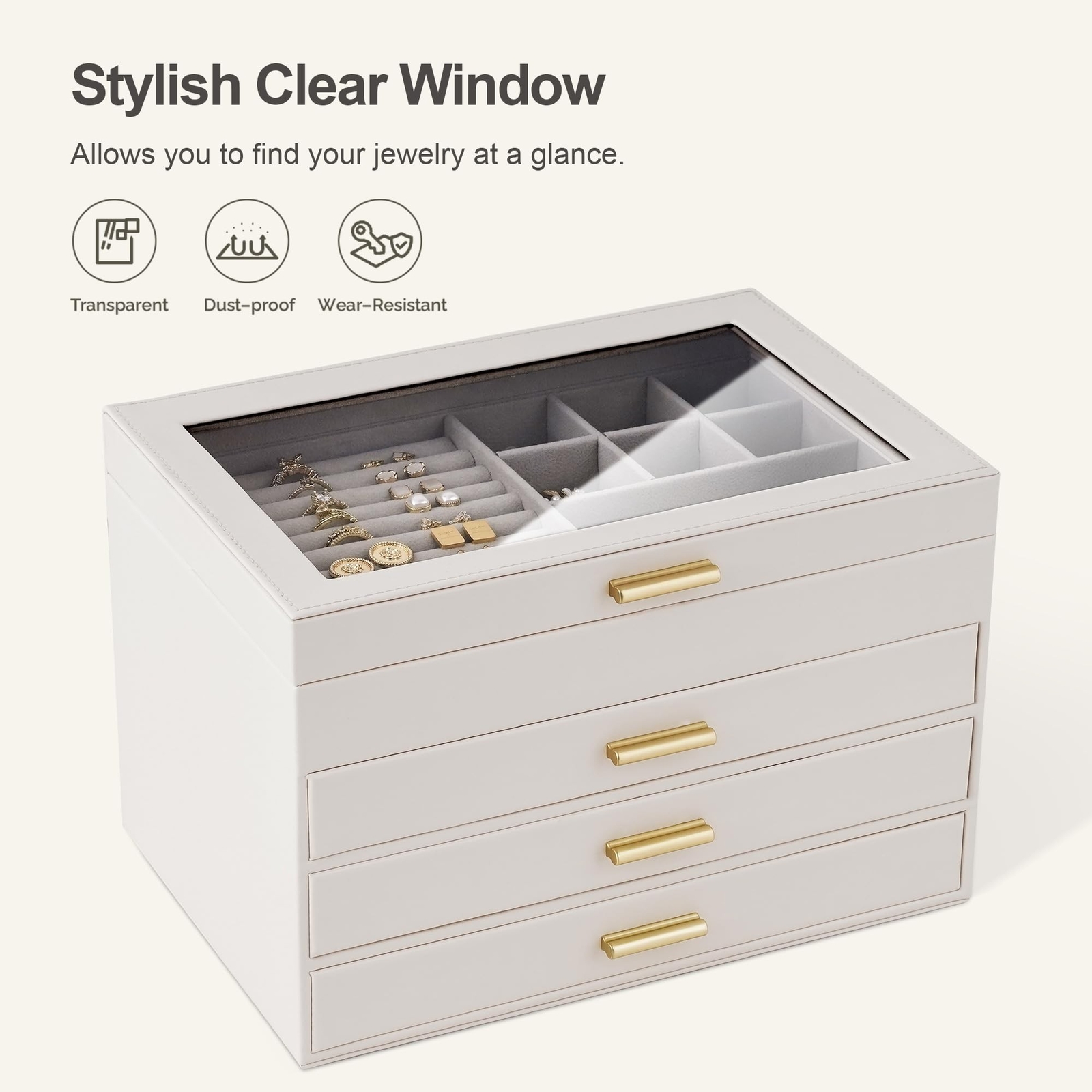 Jewelry Box with Clear Lid, 4-Layer Jewelry Organizer, 3 Drawers Large Capacity for Necklace Earrings Rings Storage, Gift for Women, Cream White Product Details Color: Cream White Brand: BIQI MUSSE Material: Faux Leather Style: Modern Special Feature: Adjustable Recommended Uses For Product: Necklace, Bracelet, Ring, Watch, Earring, Bangle Product Dimensions: 10.4"D x 7.1"W x 6.9"H Target Audience: Women, Girls Shape: Rectangular Occasion: Mother's Day, New Year, Christmas, Valentine's Day Item Dimensions D x W x H: 10.4"D x 7.1"W x 6.9"H Brand Name: BIQI MUSSE Recommended Uses For Product: Necklace, Bracelet, Ring, Watch, Earring, Bangle Target Audience: Women, Girls Number of Drawers: 3 Jewelry Storage Type: Jewelry Box Mounting Type: Table Top Closure Type: Magnetic Special Features: Adjustable Shape: Rectangular Occasion: Mother's Day, New Year, Christmas, Valentine's Day Style: Modern Color: Cream White Material: Faux Leather 4-Tier Jewelry Box: Designed to keep your precious collections organized and dazzlingly displayed, boasts ample space for storing necklaces, bracelets, earrings, and rings of all shapes and sizes. Featuring a clear lid that showcases your treasures with pride, allows for easy access your beloved jewelries, also adds a touch of delication to your vanity or dresser Functional Storage: Each tier is thoughtfully structured to maximize storage space while ensuring easy access to every piece. Equipped with multiple independent compartments, it allows you to store various jewelry items separately, include a drawer with 8 necklace hooks, ensuring your necklace stays neatly organized and tangle-free Exquisite Craftsmanship: Jewelry storage box made of premium PU leather, protects your valuables from dust and scratches, soft flannel lining in grey color take good care of your precious, prevent them oxidation. Its sleek design blends seamlessly into any decor, making it a stylish addition to your bedroom Overall Dimensions: Jewelry organizer measures 10.4L*7.08W*6.8H inch. Large capacity keep all your jewelry organized in this jewelry box. Elevate your jewelry storage experience and indulge in the luxury of having your treasures beautifully presented and within reach Perfect Gift Ideal: Whether you're a jewelry lovers or simply looking to keep your accessories organized, this large capacity clear lid jewlery holder organizer is the ultimate solution. Also will be a best gift for your loved ones on Valentine's Day, Christmas or New Year, provide all-round protection for her beloved jewelries