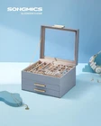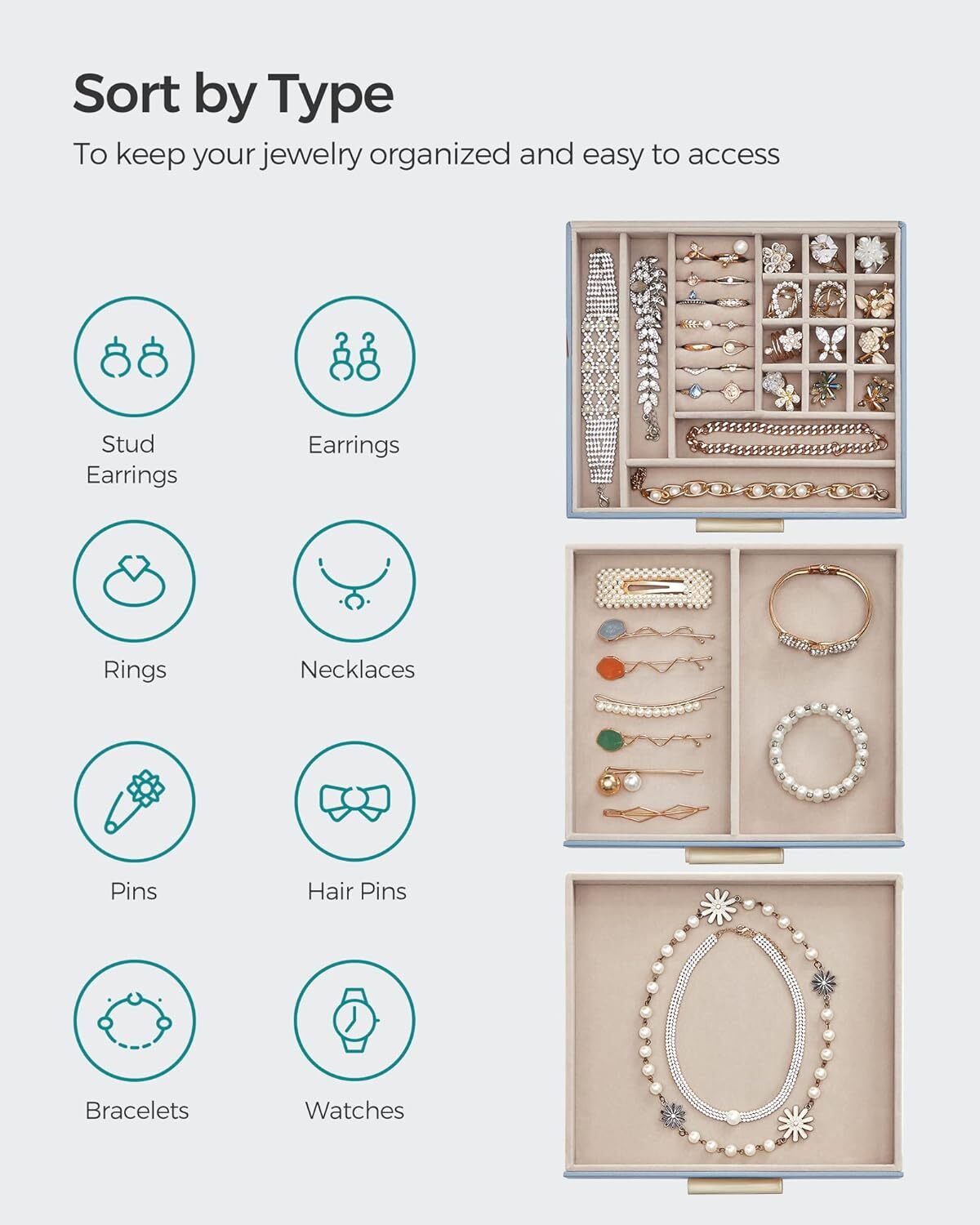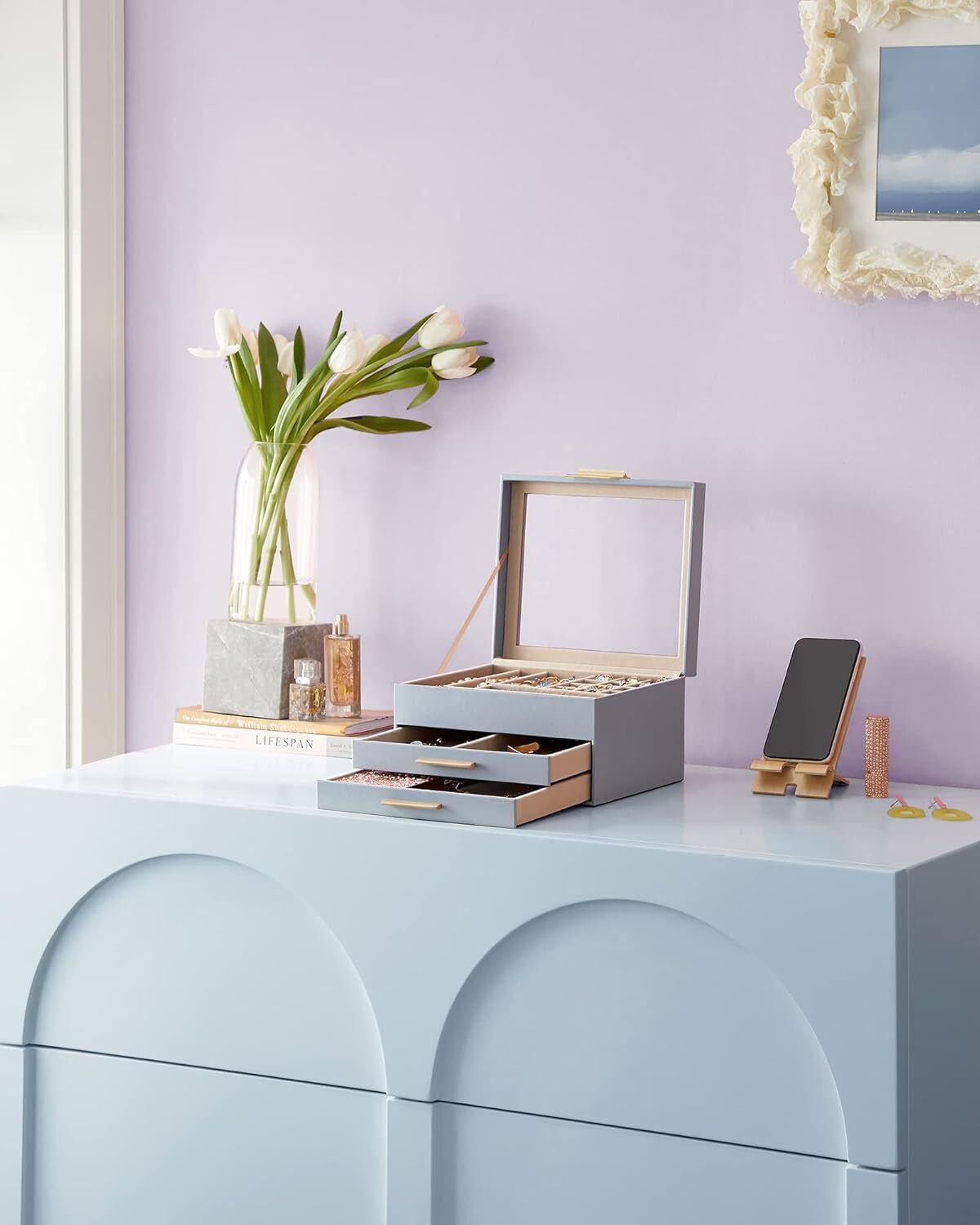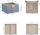 Product Description Clear Glass Lid The see-through lid looks stylish and allows you to admire your favorite jewels without opening the lid. The Top Layer Four narrow compartments for your necklaces or chain bracelets; eight ring slots; 12 small cubes for earrings, pins, or other small accessories. The Second Layer Two big compartments to store your bangles or bracelets. The Third Layer A drawer without a partition to store your jewelry as you need. Non-Slip Drawer Handles Each of the two drawers of this jewelry case comes with a non-slip handle so you can slide them in and out easily. Removable Partition The partition in the 12-compartment section of the top tray is removable to allow you to store big jewels like bracelets. Extra Protection During Transit The glass lid of this jewelry box is protected by double layers of polystyrene to prevent it from breaking during transport. The jewelry storage series offers you a variety of chic, classic jewelry boxes to keep all your jewelry well protected and cared for. Your eyes will light up each time you open the jewelry box as if you’re opening up a treasure chest. Treat yourself to this chic jewelry box that speaks volumes about your self-love, confidence, and pursuit of quality life. Specifications: Color: Smoky Blue, Gold Material: MDF (Medium Density Fiberboard), PU (Polyurethane), Velvet, Glass Product Size: 8’’D x 9.1’’W x 5.3’’H (20.3 x 23.1 x 13.5 cm) Product Weight: 3 lb (1.4 kg) Package Contents: 1 x Jewelry Box Notes: Protect the product from moisture. If the surface of the product gets dusty, please wipe the dust off with a soft cloth.