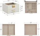 [Storage, 3 Layers] Keep all your jewelry organized in this jewelry box—small pieces of jewelry go in the various slots of the top layer, and big jewelry goes in the bottom 2 drawers [Clear Glass Lid] The see-through glass lid of this jewelry organizer allows you to see and find your favorite jewels at a glance while protecting them from dust, keeping your jewelry ready to wear and clean [Chic & Durable] Elegant white and gold colors, shiny metal handles, soft velvet lining, neat stitching, quality PU, and sturdy MDF—all these elements combined make this jewelry case stylish and durable enough for your ever-growing jewelry collection [Perfect Gift Idea] Gift this original design jewelry box to your loved ones on Valentine's Day, for their birthday or anniversary to surprise them! Or, treat yourself to this fancy jewelry box—you deserve it! [Versatile Use] This modern jewelry holder looks nice whether displayed on the dresser of your bedroom or your cloakroom to organize your pins, necklaces, rings, bracelets, and other accessories