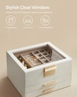 [Storage, 3 Layers] Keep all your jewelry organized in this jewelry box—small pieces of jewelry go in the various slots of the top layer, and big jewelry goes in the bottom 2 drawers [Clear Glass Lid] The see-through glass lid of this jewelry organizer allows you to see and find your favorite jewels at a glance while protecting them from dust, keeping your jewelry ready to wear and clean [Chic & Durable] Elegant white and gold colors, shiny metal handles, soft velvet lining, neat stitching, quality PU, and sturdy MDF—all these elements combined make this jewelry case stylish and durable enough for your ever-growing jewelry collection [Perfect Gift Idea] Gift this original design jewelry box to your loved ones on Valentine's Day, for their birthday or anniversary to surprise them! Or, treat yourself to this fancy jewelry box—you deserve it! [Versatile Use] This modern jewelry holder looks nice whether displayed on the dresser of your bedroom or your cloakroom to organize your pins, necklaces, rings, bracelets, and other accessories