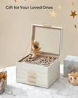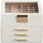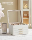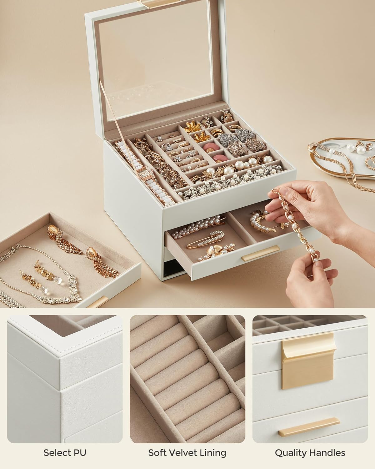 Store New Arrivals Add to Favorite View Feedback Jewelry Box with Glass Lid, 4-Layer Jewelry Organizer, 3 Drawers, for Big and Small Jewelry, Jewelry Storage, Modern Style, 8 X 9.1 X 6.5 Inches, Cloud White and Gold Color UJBC173W01 Description Item model number UJBC173W01 Style Modern Number of Items 1 Country of Origin China Warranty Type No Warranty Jewelry Storage Type Jewelry Box Number of Compartments 6 Special Feature Durable, Jewelry Organizer Product Dimensions 8"D x 9.1"W x 6.5"H Material MDF (Medium Density Fiberboard), PU (Polyurethane), Velvet, Glass Number of Drawers 3 Finish Type Polyurethane Closure Type Magnetic Item Weight 3.74 pounds Occasion Anniversary, New Home, Birthday Target Audience Women Mounting Type Table Top Color Cloud White + Gold Inner Material Velvet Global Trade Identification Number 00194343127903 Shape Rectangular Recommended Uses For Product Necklace, Bracelet, Ring, Watch, Earring, Bangle Size 4 Layer (6.5"H) [Storage, 4 Layers] Keep all your jewelry organized in this jewelry box—small pieces of jewelry go in the various slots of the top layer, and big jewelry goes in the bottom 3 drawers [Clear Glass Lid] The see-through glass lid of this jewelry organizer allows you to see and find your favorite jewels at a glance while protecting them from dust, keeping your jewelry ready to wear and clean [Chic & Durable] Elegant white and gold colors, shiny metal handles, soft velvet lining, neat stitching, quality PU, and sturdy MDF—all these elements combined make this jewelry case stylish and durable enough for your ever-growing jewelry collection [Perfect Gift Idea] Gift this original design jewelry box to your loved ones for their birthday or anniversary to surprise them! Or, treat yourself to this fancy jewelry box—you deserve it! [Versatile Use] This modern jewelry holder looks nice whether displayed on the dresser of your bedroom or your cloakroom to organize your pins, necklaces, rings, bracelets, and other accessories Product Description The 1st Layer 4 narrow compartments for your necklaces or chain bracelets; 8 ring slots; 12 small cubes for earrings, pins, or other small accessories. The 2rd Layer 12 small compartments to store your jewelry as you need. The 3rd Layer 2 big compartments to store your bangles or bracelets. The 4th Layer A drawer without a partition to store your large jewelry and watches. Each of the 3 drawers comes with a non-slip handle so you can slide them in and out easily The partition in the 12-compartment section of the top tray is removable to store big jewels The glass lid is protected by double layers of polystyrene to prevent breaking during transport 1 Non-Slip Drawer Handles 2 Removable Partition 3 Protection During Transit The SONGMICS jewelry storage series offers you a variety of chic, classic jewelry boxes to keep all your jewelry well protected and cared for. Your eyes will light up each time you open the jewelry box as if you’re opening up a treasure chest. Treat yourself to this chic SONGMICS jewelry box that speaks volumes about your self-love, confidence, and pursuit of quality life. Specifications: Color: Cloud White, Gold Material: MDF (Medium Density Fiberboard), PU (Polyurethane), Velvet, Glass Product Size: 8"D x 9.1"W x 6.5"H (20.3 x 23.1 x 16.5 cm) Product Weight: 3.7 lb (1.7 kg) Package Contents: 1 x Jewelry Box SONGMICS Notes: Protect the product from moisture. If the surface of the product gets dusty, please wipe the dust off with a soft cloth. Find Your Favorite Add to Cart Add to Cart Add to Cart Add to Cart Add to Cart Add to Cart Add to Cart Customer Reviews 4.8 out of 5 stars 3,947 4.7 out of 5 stars 71 4.7 out of 5 stars 600 4.5 out of 5 stars 694 4.5 out of 5 stars 757 4.7 out of 5 stars 3,810 4.6 out of 5 stars 2,548 Price $42.99 $ 42 . 99 $32.99 $ 32 . 99 $69.99 $ 69 . 99 $13.98 $ 13 . 98 $29.99 $ 29 . 99 $37.99 $ 37 . 99 $52.99 $ 52 . 99 Number of Layers 4 3 5 2 4 4 6 With Glass Lid ✔ ✘ ✔ ✘ ✔ ✔ ✘ Lockable ✘ ✘ ✘ ✘ ✘ ✘ ✔ With Removable Tray ✘ ✘ ✘ ✔ ✔ ✘ ✘ Product Size (D x W x H) 8"D x 9.1"W x 6.5"H 9.1"D x 9.1"W x 5.5"H 6.3"D x 8.7"W x 11.2"H 4.3"D x 6.3"W x 3.1"H 6.7"D x 11"W x 7.2"H 6"D x 9.9"W x 8.5"H 6.1”D x 10.2”W x 12.6”H ABOUT US We offer the best prices around on high quality products. Our E-store includes media such as books, movies, music and games while offering electronics, toys, sporting apparel, clothing, tools, general home, garden items and more. SHIPPING We are always working hard to ensure your package arrives as soon as possible. Please understand that some factors like weather, high postal traffic, and the performance of shipping companies are outside of our control. We offer free shipping to the lower 48 states and ship within 2 business days of payment, usually sooner. We do not accept P.O. Boxes. Please provide a physical address. RETURNS We offer a 30-Day Return Policy on items which you are not completely satisfied with. You have the option for a full-refund or an exchange of the item. No returns are available on items shipped outside of the USA. PAYMENT We accept PayPal. CONTACT US This page content is yet to come Please ad us to your favorite seller and visit again later Thank You