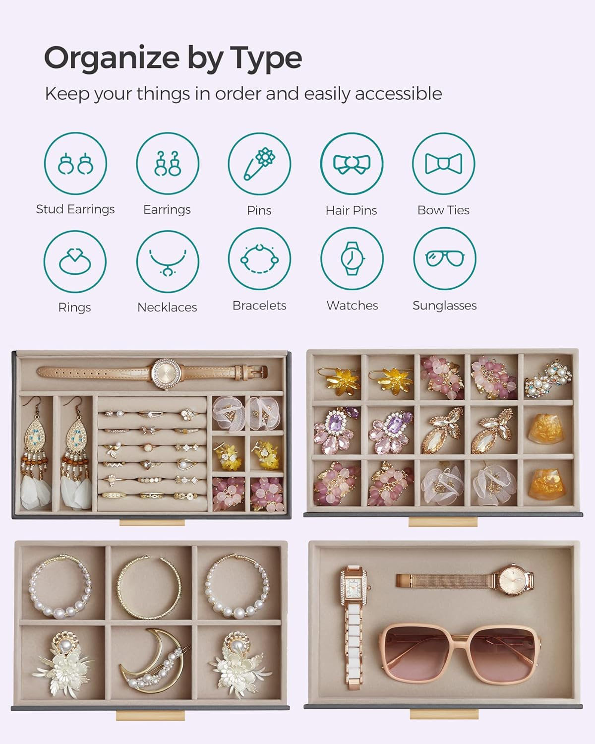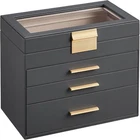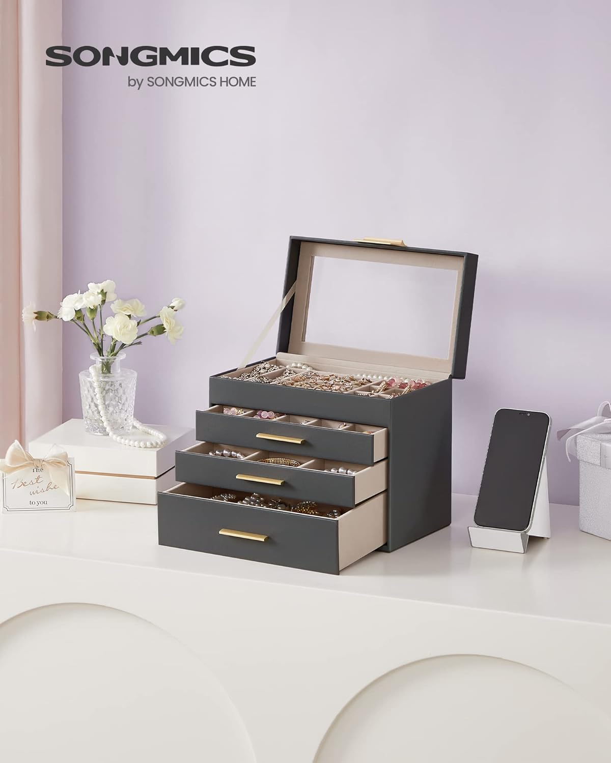 Store New Arrivals Add to Favorite View Feedback Contact Jewelry Box with Glass Lid, 4-Layer Jewelry Organizer, 3 Drawers, for Sunglasses, Big Jewelry, Jewelry Storage, Modern Style, Gray and Gold Color UJBC161C01 Description Style Modern Number of Items 1 Size 4 Layer (6"D x 8.5"H) Country of Origin China Warranty Type limited warranty Batteries Included? No Jewelry Storage Type Jewelry Box Batteries Required? No Number of Compartments 4 Special Feature Durable,Jewelry Organizer,See-through Product Dimensions 6"D x 9.9"W x 8.5"H Material MDF (Medium Density Fiberboard), PU (Polyurethane), Velvet, Glass Number of Drawers 3 Finish Type Glossy Included Components 1 x Jewelry Box Closure Type Magnetic Item Weight 3.74 pounds Finish Glossy Occasion New Home, Anniversary, Birthday Special Features Durable,Jewelry Organizer,See-through Target Audience Women, Girls Part Number UJBC161C01 Mounting Type Table Top Color Gray + Gold Inner Material Velvet Global Trade Identification Number 00194343123615 Shape Rectangular Recommended Uses For Product Necklace, Bracelet, Ring, Watch, Earring, Bangle Number Of Pieces 1 [Storage, 4 Layers] Keep all your jewelry organized in this jewelry box—small pieces of jewelry go in the various slots of the top 3 layers, and sunglasses and watches go in the big bottom drawer [Clear Glass Lid] The see-through glass lid of this jewelry organizer allows you to see and find your favorite jewels at a glance while protecting them from dust, keeping your jewelry ready to wear and clean [Chic & Durable] Elegant gray and gold colors, shiny metal handles, soft velvet lining, neat stitching, quality PU, and sturdy MDF—all these elements combined make this jewelry case stylish and durable enough for your ever-growing jewelry collection [Perfect Gift Idea] Gift this original design jewelry box to your loved ones for their birthday or anniversary to surprise them! Or, treat yourself to this fancy jewelry box—you deserve it! [Versatile Use] This modern jewelry holder looks nice whether displayed on the dresser of your bedroom or your cloakroom to organize your pins, necklaces, rings, bracelets, and other accessories Product Description The Top Layer 3 narrow compartments for your necklaces or chain bracelets; 7 ring slots; 6 small cubes for earrings, pins, or other small accessories. The Second Layer 15 medium-sized compartments for pins, big rings, earrings, as well as hair ties. The Third Layer 6 big compartments to store your bangles, bracelets, or small watches. The Fourth Layer A deep drawer without a partition to hold your large pieces of jewelry, sunglasses, or big watches like sports watches. Non-Slip Drawer Handles Each of the three drawers of this jewelry case comes with a non-slip handle so you can slide them in and out easily. Extra Protection During Transit The glass lid of this jewelry box is protected by double layers of polystyrene to prevent it from breaking during transport. The SONGMICS jewelry storage series offers you a variety of chic, classic jewelry boxes to keep all your jewelry well protected and cared for. Your eyes will light up each time you open the jewelry box as if you’re opening up a treasure chest. Treat yourself to this chic SONGMICS jewelry box that speaks volumes about your self-love, confidence, and pursuit of quality life. Specifications: Color: Gray, Gold Material: MDF (Medium Density Fiberboard), PU (Polyurethane), Velvet, Glass Product Size: 6"D x 9.9"W x 8.5"H (15.3 x 25.1 x 21.5 cm) Product Weight: 3.7 lb (1.7 kg) Package Contents: 1 x Jewelry Box SONGMICS Notes: Protect the product from moisture. If the surface of the product gets dusty, please wipe the dust off with a soft cloth. Explore Your Favorite Add to Cart Add to Cart Add to Cart Add to Cart Add to Cart Add to Cart Add to Cart Customer Reviews 4.7 out of 5 stars 3,808 4.6 out of 5 stars 2,546 4.7 out of 5 stars 1,771 4.7 out of 5 stars 595 4.8 out of 5 stars 3,943 4.8 out of 5 stars 3,943 4.5 out of 5 stars 756 Price $49.99 $ 49 . 99 $49.99 $ 49 . 99 $41.99 $ 41 . 99 $55.99 $ 55 . 99 $42.99 $ 42 . 99 $37.99 $ 37 . 99 $29.99 $ 29 . 99 Number of Layers 6 6 / 5 4 3 4 Color Dove Gray + Gold Gray Slate Gray + Metallic Gold Slate Gray Dove Gray + Gold Interstellar Gray + Gold Dove Gray Glass lid ✔ ✘ ✔ ✔ ✔ ✔ ✔ Lockable ✘ ✔ ✘ ✘ ✘ ✘ ✘ Removable Tray ✘ ✘ ✘ ✘ ✘ ✘ ✔ Product Size (D x W x H) 6.4"D x 9.9"W x 11.4"H 6.1"D x 10.2"W x 12.6"H 6.1"D x 10.3"W x 12.6"H 6.3"D x 8.7"W x 11.2"H 8"D x 9.1"W x 6.5"H 8"D x 9.1"W x 5.3"H 6.7"D x 11"W x 7.2"H Mirror ✘ ✔ ✘ ✘ ✘ ✘ ✘ ABOUT US We offer the best prices around on high quality products. Our E-store includes media such as books, movies, music and games while offering electronics, toys, sporting apparel, clothing, tools, general home, garden items and more. SHIPPING We are always working hard to ensure your package arrives as soon as possible. Please understand that some factors like weather, high postal traffic, and the performance of shipping companies are outside of our control. We offer free shipping to the lower 48 states and ship within 2 business days of payment, usually sooner. We do not accept P.O. Boxes. Please provide a physical address. For shipping outside of the continental USA, we only use eBay's Global Shipping Program.The item is shipped to KY and then sent to the rest of the world. International customers are responsible for all duties and taxes. Continue to check out in order to calculate costs for shipping the item to your country. Messages regarding eBay's Global Shipping Program MUST be directed at eBay EXCLUSIVELY. RETURNS We offer a 30-Day Return Policy on items which you are not completely satisfied with. You have the option for a full-refund or an exchange of the item. No returns are available on items shipped outside of the USA. PAYMENT We accept PayPal. CONTACT US This page content is yet to come Please ad us to your favorite seller and visit again later Than