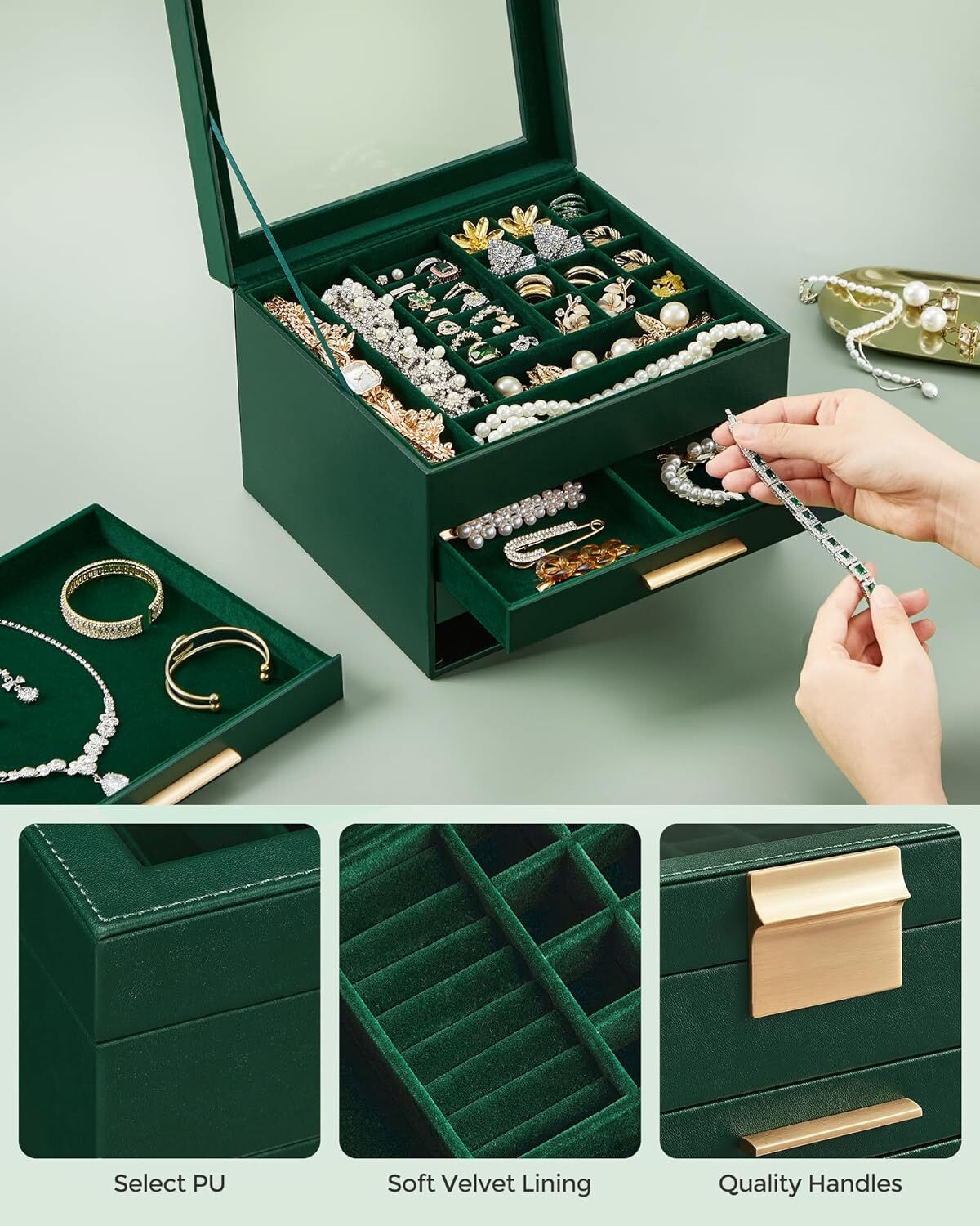 [Storage, 4 Layers] Keep all your jewelry organized in this jewelry box—small pieces of jewelry go in the various slots of the top layer, and big jewelry goes in the bottom 3 drawers [Clear Glass Lid] The see-through glass lid of this jewelry organizer allows you to see and find your favorite jewels at a glance while protecting them from dust, keeping your jewelry ready to wear and clean [Chic & Durable] Elegant green and gold colors, shiny metal handles, soft velvet lining, neat stitching, quality PU, and sturdy MDF—all these elements combined make this jewelry case stylish and durable enough for your ever-growing jewelry collection [Perfect Gift Idea] Gift this original design jewelry box to your loved ones on Valentine's Day, for their birthday or anniversary to surprise them! Or, treat yourself to this fancy jewelry box—you deserve it! [Versatile Use] This modern jewelry holder looks nice whether displayed on the dresser of your bedroom or your cloakroom to organize your pins, necklaces, rings, bracelets, and other accessoriesa