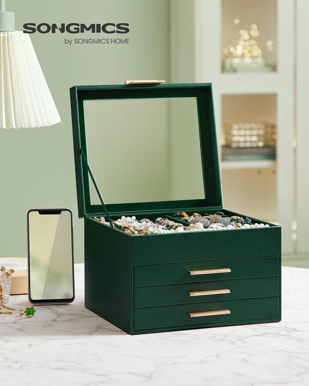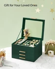 [Storage, 4 Layers] Keep all your jewelry organized in this jewelry box—small pieces of jewelry go in the various slots of the top layer, and big jewelry goes in the bottom 3 drawers [Clear Glass Lid] The see-through glass lid of this jewelry organizer allows you to see and find your favorite jewels at a glance while protecting them from dust, keeping your jewelry ready to wear and clean [Chic & Durable] Elegant green and gold colors, shiny metal handles, soft velvet lining, neat stitching, quality PU, and sturdy MDF—all these elements combined make this jewelry case stylish and durable enough for your ever-growing jewelry collection [Perfect Gift Idea] Gift this original design jewelry box to your loved ones for their birthday or anniversary to surprise them! Or, treat yourself to this fancy jewelry box—you deserve it! [Versatile Use] This modern jewelry holder looks nice whether displayed on the dresser of your bedroom or your cloakroom to organize your pins, necklaces, rings, bracelets, and other accessoriesa