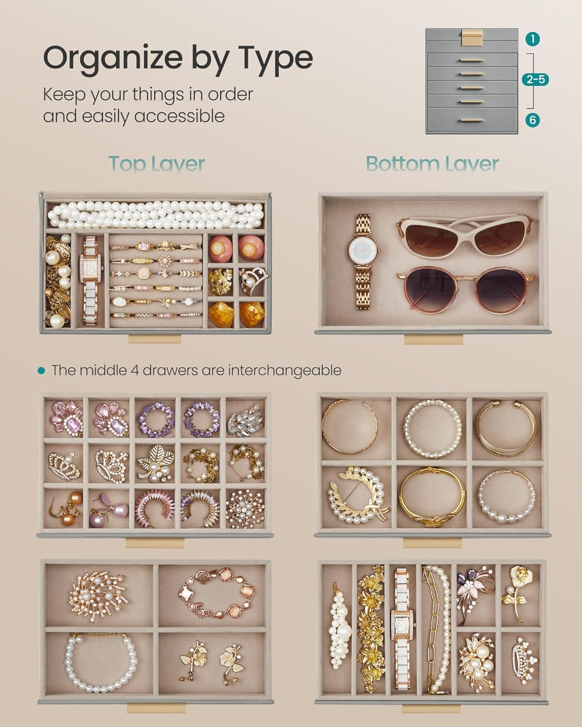 Material MDF (Medium Density Fiberboard), PU (Polyurethane), Velvet, Glass Style Modern Special Feature Jewelry Organizer, Durable, Clear Glass Lid Recommended Uses For Product Necklace, Bracelet, Ring, Watch, Earring, Bangle Product Dimensions 6.4"D x 9.9"W x 11.4"H Target Audience Women, Girls Shape Rectangular Occasion Anniversary, New Home, Birthday See less About this item [Storage, 6 Layers] Keep all your jewelry organized in this jewelry box—small pieces of jewelry go in the various slots of the top 5 layers, and sunglasses and watches go in the big bottom drawer [Clear Glass Lid] The see-through glass lid of this jewelry organizer allows you to see and find your favorite jewels at a glance while protecting them from dust, keeping your jewelry ready to wear and clean [Chic & Durable] Elegant dove gray and gold colors, shiny metal handles, soft velvet lining, neat stitching, quality PU, and sturdy MDF—all these elements combined make this jewelry case stylish and durable enough for your ever-growing jewelry collection [Perfect Gift Idea] Gift this original design jewelry box to your loved ones for their birthday or anniversary to surprise them! Or, treat yourself to this fancy jewelry box—you deserve it! [Versatile Use] This modern jewelry holder looks nice whether displayed on the dresser of your bedroom or your cloakroom to organize your pins, necklaces, rings, bracelets, and other accessories Material MDF (Medium Density Fiberboard), PU (Polyurethane), Velvet, Glass Style Modern Special Feature Jewelry Organizer, Durable, Clear Glass Lid Recommended Uses For Product Necklace, Bracelet, Ring, Watch, Earring, Bangle Product Dimensions 6.4"D x 9.9"W x 11.4"H Target Audience Women, Girls Shape Rectangular Occasion Anniversary, New Home, Birthday Mounting Type Table Top Finish Type Polished Inner Material Velvet Closure Type Drawer