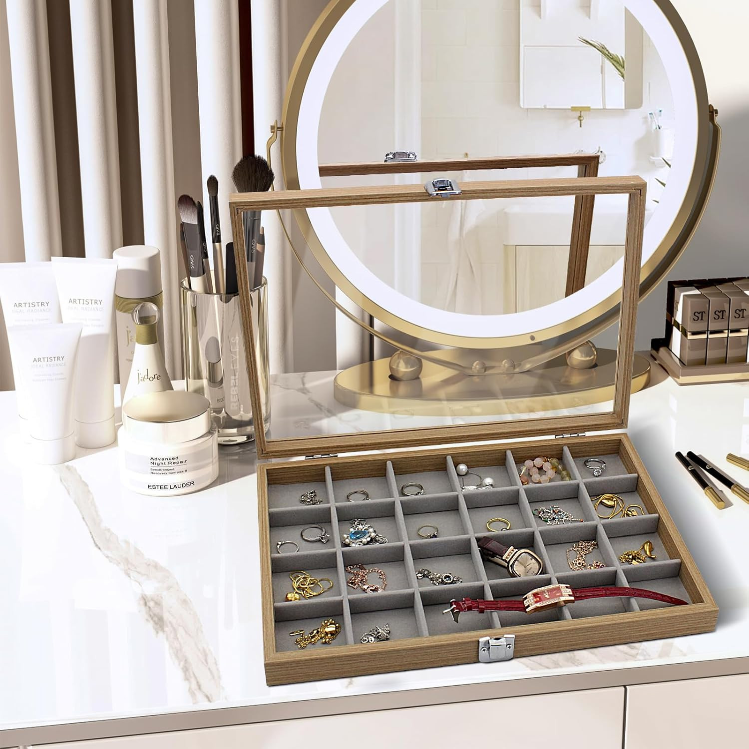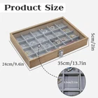 Jewelry Box with Glass Lid, Wood Organizer Box, 24-Grid Earring Grey Product Details Color: Grey Brand: WisePoint Material: Wood, Metal Style: style 1 Special Feature: Lock Recommended Uses For Product: Necklace, Bracelet, Ring, Watch, Earring Product Dimensions: 5"D x 35"W x 24"H Shape: Rectangular Occasion: all Mounting Type: Table Top Finish Type: Fabric-lined Inner Material: Velvet Closure Type: Key Lock Number of Drawers: 24 Number of Compartments: 24 Jewelry Storage Type: Jewelry Box Manufacturer: WisePoint Item Weight: 2.2 pounds Finish: Fabric-lined Special Features: Lock Included Components: 24 Batteries Required?: No Color: Grey Brand: WisePoint Material: Wood, Metal Style: style 1 Special Feature: Lock Recommended Uses For Product: Necklace, Bracelet, Ring, Watch, Earring Product Dimensions: 5"D x 35"W x 24"H Shape: Rectangular Occasion: all Mounting Type: Table Top Wood+Velvet+Metal: These jewelry trays are made of sturdy wood and soft velvet. The cover with gray velvet looks exquisite. The metal hinges and lock catch are flexible and with a longer lifespan High Transparency Glass: Our jewelry box has a high transparency glass cover that can display and distinguish different jewelry, and effectively prevent dust. The jewelry box is equipped with a metal buckle, providing multiple protections for your jewelry Detachable Dividing Plates: The velvet partition of the earring organizer box is detachable, and the size of each compartment can be adjusted by removing the partition. It can provide up to 24 segmented compartments. It can store jewelry of different sizes as needed, which is practical High-capacity Storage Box: This jewelry holder organizer box measures 35 * 24 * 5 cm in size, with each compartment measuring approximately 5 * 5 cm. It can be used to store necklaces, watches, bracelets, brooches, rings, earrings, buttons, pins, and other valuable items Jewelry Storage and Display: Our velvet jewelry boxes are perfect for home use and can be placed on a dressing table, bedside table, or drawer. It is also suitable for displaying jewelry in the showcase of stores or exhibitions, and the glass cover does not affect the display while also protecting the jewelry Material: wood+glass Size: 35 * 24 * 5cm Weight: 0.9kg Package: jewelry tray* 1 Tips: 1. Due to the shooting light, please allow chromatic aberration. 2. The size and weight are manually measured, please allow for a little error.