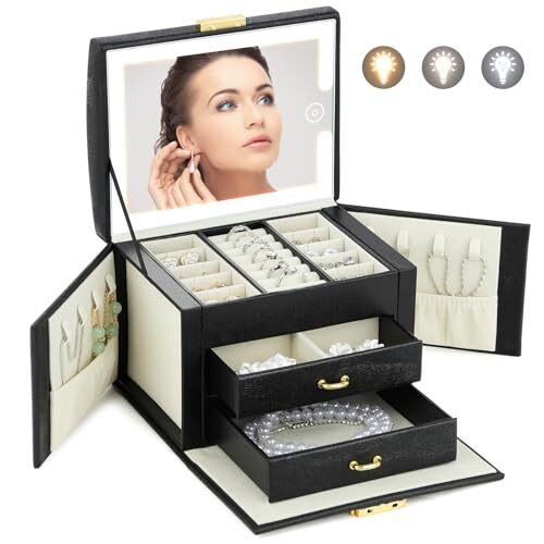 Menu 1. We require immediate payment. 2. We currently accept payment via eBay managed payments only. 3. Once payment is cleared, we will dispatch your shipment within 1-3 business days. Please refer to the "Shipping" tab for more information regarding shipping speed to your destination. Jewelry Box with LED Mirror, 3-Tier Jewelry Storage Organizer with 2 Drawers, PU Surface, Gift for Women Girls Display for Earrings Bracelets Rings Watches (Black) Product description ADJUSTABLE AND LIGHTED MIRROR: jewelry box features a large touch-control LED mirror. It has 3 light modes that can switch between cold, natural, and warm lighting. Long press to control the brightness from 0% to 100% providing optimal lighting and convenience for perfecting makeup or trying on jewelry LARGE CAPACITY: Jewelry organizer box has 2 drawers for small accessory, 2 retractable necklace boards, 8 earing studs boards, and 7ring roll. DIY storage partitions make your jewelry all covered in the box, no more rummaging for your desired piece during hectic mornings RECHARGEABLE JEWELRY BOX: The jewelry box with mirror Built-in rechargeable 1000mAh lithium battery, through universal Type-C port charging,don't worry about the battery running out when using it ELEGANCE MEETS QUALITY: The jewelry box with lock and a smooth metal buckle for easy opening and closing, soft velvet lining, quality PU leather and sturdy construction for durability and style PERFECT GIFT: This elegant LED jewelry box will be your fine gift choice to show your care to your families, lover or friends on Thanks giving, Valentine's day, Christmas or other special occasions PLEASE MESSAGE US IF YOU HAVE ANY OTHER QUESTIONS, AND MANY THANKS FOR READING ALL OF THIS. Copyright ©#. All Rights Reserved.