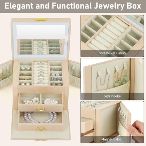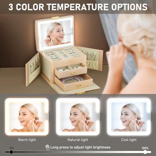 Return Policy Fast Delivery Trusted seller Jewelry Box with LED Mirror, 3-Tier Jewelry Storage Organizer with 2 Drawers, PU Surface, Gift for Women Girls Display for Earrings Bracelets Rings Watches (Pink) Product Description ADJUSTABLE AND LIGHTED MIRROR: jewelry box features a large touch-control LED mirror. It has 3 light modes that can switch between cold, natural, and warm lighting. Long press to control the brightness from 0% to 100% providing optimal lighting and convenience for perfecting makeup or trying on jewelry LARGE CAPACITY: Jewelry organizer box has 2 drawers for small accessory, 2 retractable necklace boards, 8 earing studs boards, and 7ring roll. DIY storage partitions make your jewelry all covered in the box, no more rummaging for your desired piece during hectic mornings RECHARGEABLE JEWELRY BOX: The jewelry box with mirror Built-in rechargeable 1000mAh lithium battery, through universal Type-C port charging,don't worry about the battery running out when using it ELEGANCE MEETS QUALITY: The jewelry box with lock and a smooth metal buckle for easy opening and closing, soft velvet lining, quality PU leather and sturdy construction for durability and style PERFECT GIFT: This elegant LED jewelry box will be your fine gift choice to show your care to your families, lover or friends on Thanks giving, Valentine's day, Christmas or other special occasions Shipping Returns Payment Shipping Shipping is FREE to all addresses other than APO/PO boxes in the lower 48 states. All our stock ships from US-based warehouses. Shipped via USPS or UPS (depending on location and package weight) Unless stated otherwise, all orders will ship within 24-72 hours of your payment being processed. Check our feedback to see the great reviews of FAST shipping we offer. Returns Seller does not accept returns Payment We currently accept payment via eBay managed payments only. Once payment is cleared, we will dispatch your shipment within 1-3 business days. Please refer to the "Shipping" tab for more information regarding shipping speed to your destination.