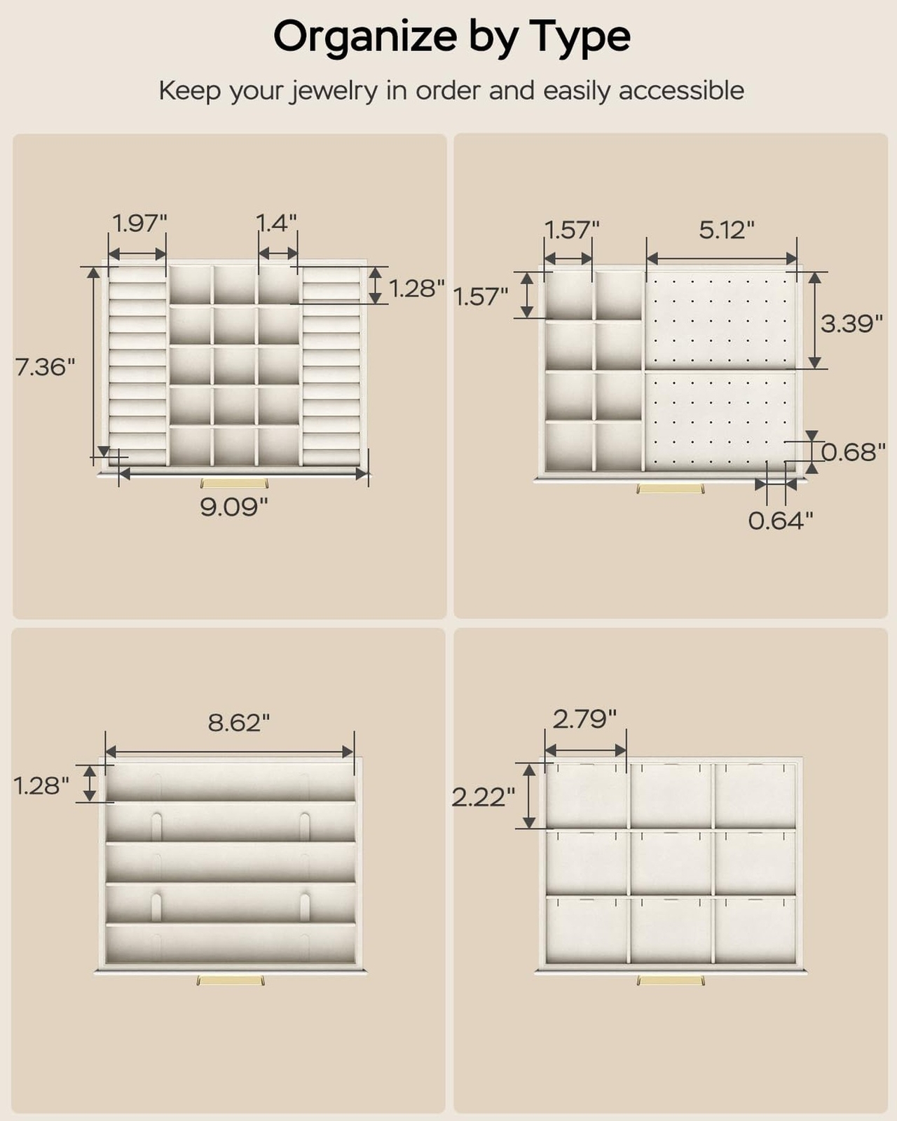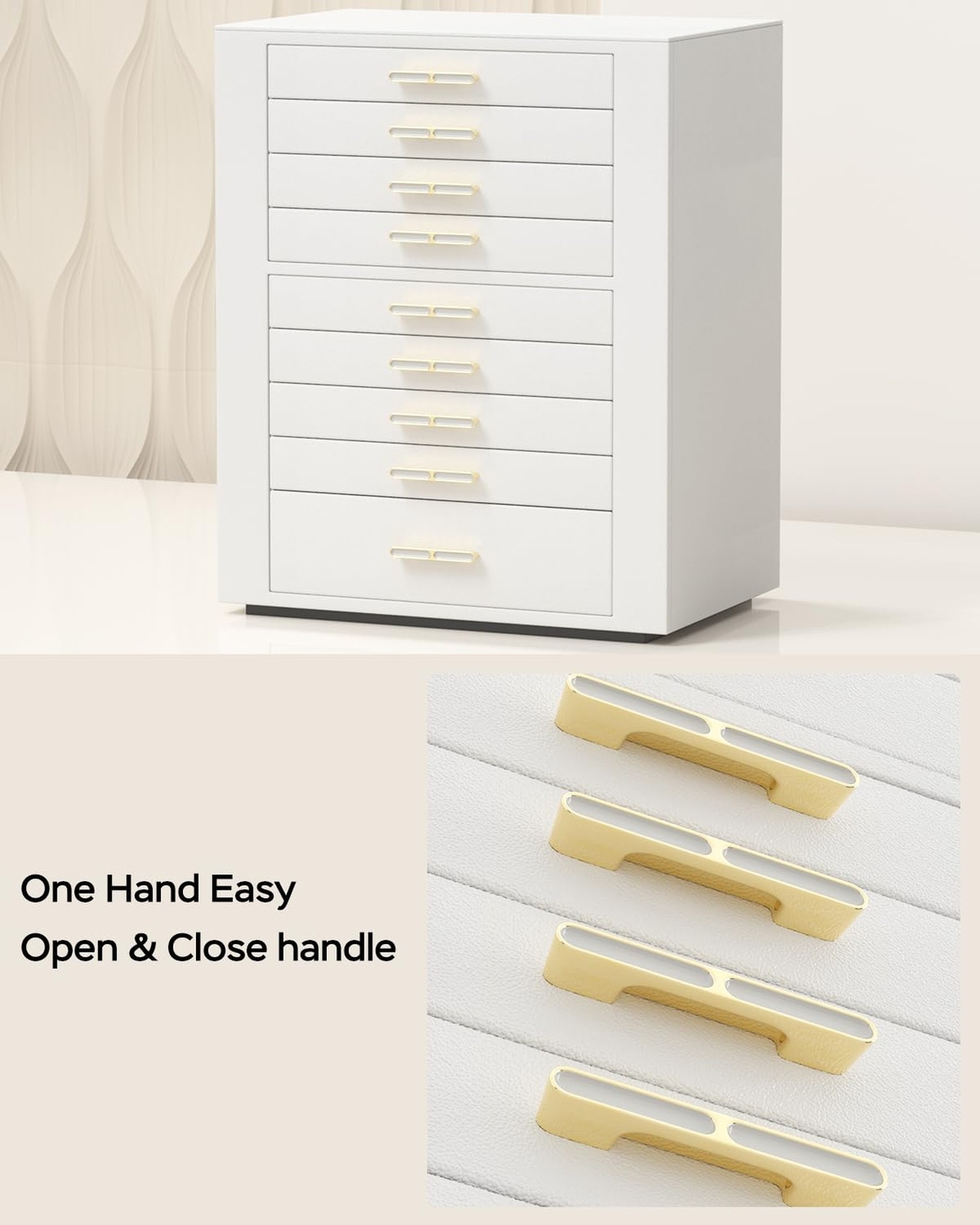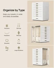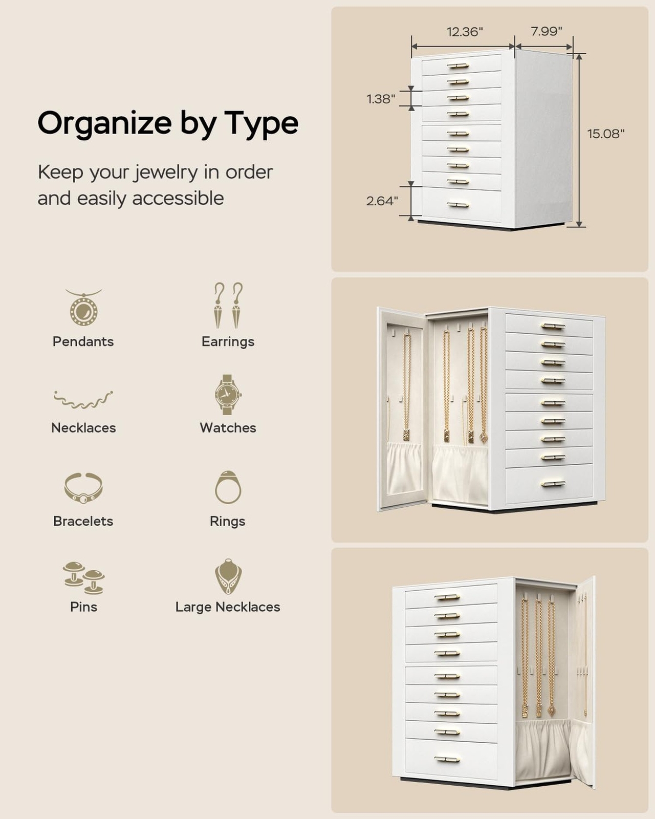 Jewelry Box with Mirror, 9 Tier Large Leather Jewelry Case with 9 Drawers & 2 Doors, Huge Storage Capacity, Jewelry Storage Organizer, Mother's Day Gifts, For Watches - C907WE - White Product Details Size: 9 Layer (15.1"H) Color: White Brand: outeyoyo MPN: C907WE UPC: Does not apply EAN: Does not apply Color: White Brand: outeyoyo Material: Engineered Wood, Polyurethane, Velvet Style: 9Layer - White Special Feature: Dustproof, Durable Recommended Uses For Product: Necklace, Bracelet, Ring, Watch, Earring, Bangle Product Dimensions: 7.99"D x 12.36"W x 15.1"H Target Audience: Women, Men, Boys, Girls Shape: Rectangular Occasion: Mother's Day, Christmas, Wedding, Anniversary, Birthday Color: White Brand: outeyoyo Material: Engineered Wood, Polyurethane, Velvet Style: 9Layer - White Special Feature: Dustproof, Durable Recommended Uses For Product: Necklace, Bracelet, Ring, Watch, Earring, Bangle Product Dimensions: 7.99"D x 12.36"W x 15.1"H Target Audience: Women, Men, Boys, Girls Shape: Rectangular Occasion: Mother's Day, Christmas, Wedding, Anniversary, Birthday Mounting Type: Table Top Finish Type: Glossy Inner Material: velvet Closure Type: Latch Number of Drawers: 9 Item Weight: 14.4 Pounds Number of Compartments: 9 Jewelry Storage Type: Jewelry Box Manufacturer: outeyoyo Part Number: C907WE Item Weight: 14.4 pounds Country of Origin: China Item model number: C907WE Size: 9 Layer (15.1"H) Finish: Glossy Item Package Quantity: 1 Special Features: Dustproof, Durable Included Components: 1 x Jewelry Box Batteries Included?: No Batteries Required?: No Date First Available: September 16, 2024 Huge capacity:Outeyoyo 9-layer jewelry box has a large capacity and can store a variety of different-shaped jewelry accessories such as watches, necklaces, earrings, bracelets, hairpins and brooches With Inner Mirror:The jewelry organizer has a mirror inside that allows you to do your makeup and check your look easily, saving precious morning time 14 Rows of Necklace Hooks:This jewelry case comes with 14 rows of hooks that feature an ideal height so all your necklaces, even the longer ones, can hang up here perfectly without getting tangled Crafted for Enduring Elegance:Boasting meticulously selected PU, robust MDF construction, a plush velvet interior, sturdy Electroplated hardware and precision stitching, Outeyoyo jewelry box is a testament to its unequaled quality and durability a cherished keeper of your treasures for years to come Ultimate Present Idea: This one-of-a-kind jewlery organizer is the perfect gift for your special someone on their birthday or anniversary and Christmas , Valentine's Day, or Mother's Day; Alternatively, spoil yourself with this elegant jewelry boxyou've earned it!