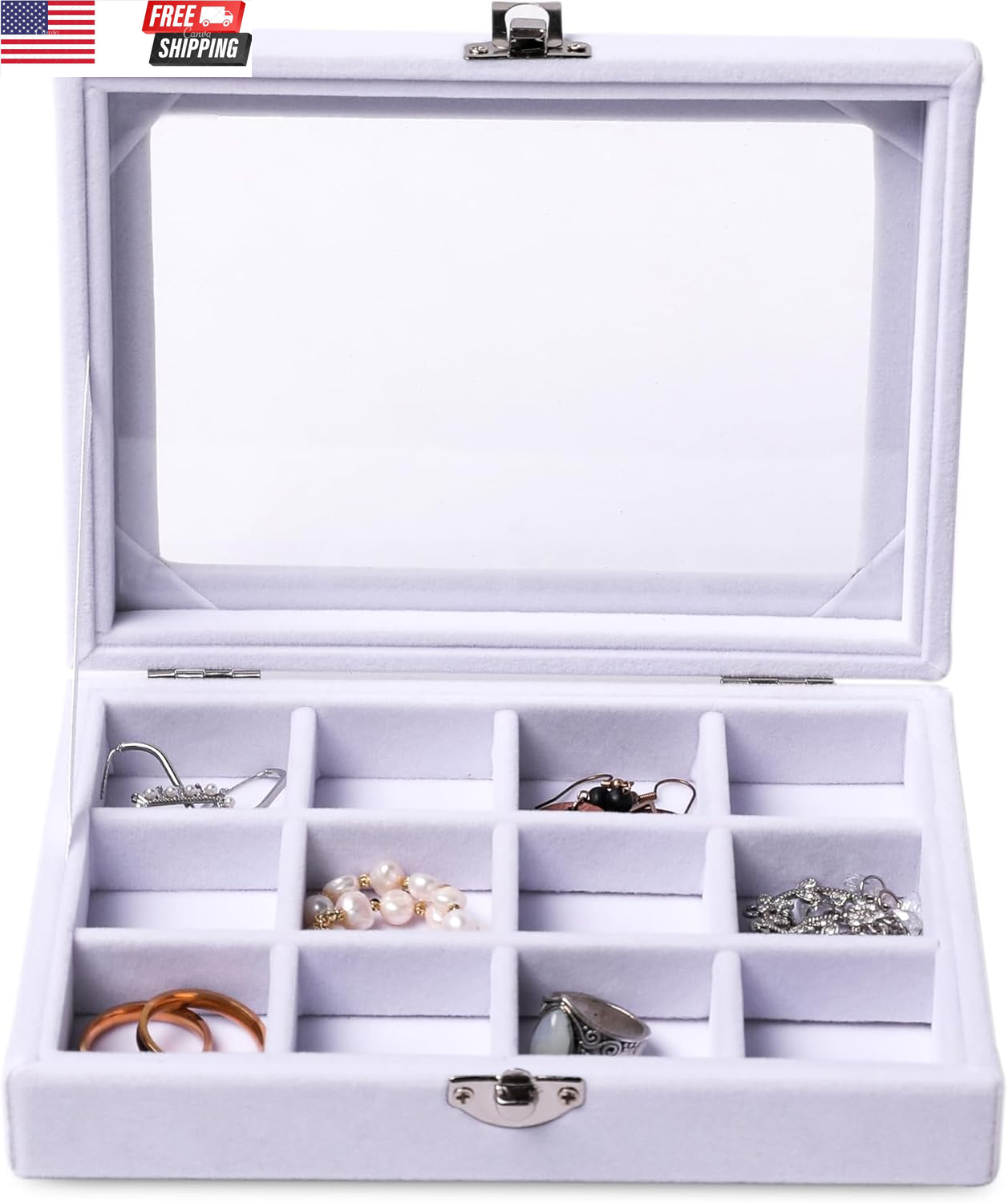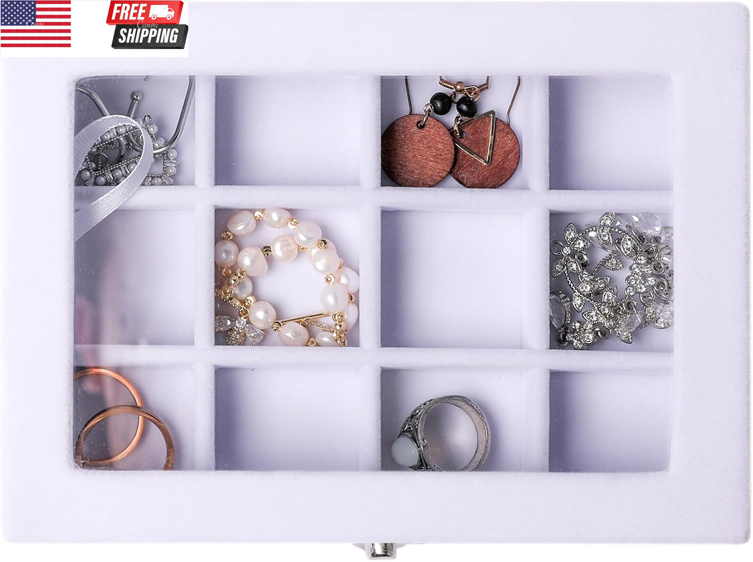Jewelry Organizer Tray with Clear Lid 12 Grid Velvet Drawer Insert Jewelry Box with Transparent Lid Jewelry Display Case Store Showcase Jewelry Box Gift for Women(White,12 Grid) Premium Material:This jewelry tray is constructed with sturdy composite and they are covered with soft velvet which feels great to touch and looks elegant. High quality material provide better protection for your jewelry and accessories 12 Grids For Organize:This jewelry tray has 12 Grids which are covered by soft velvet and each grids' size is 1½''×1½'' inch.It could be used to store rings,earrings, necklaces,brooches,buttons,pins and other valuables Safety and Convenience: This jewelry tray features a clear glass lid that enables clear display of your jewelry while keeping them from scratches,damage and dust. Completed with 2 integrated safety locks in the glass lid for adding security of effective protection on the loss of valuable goods Multi-functional Use: The jewelry tray is not only great for personal use at home like dressing table or drawer inserts but also very suitable for a counter top jewelry display in stores or jewelry trade shows Perfect gift: The size of the the Jewelry Organizer is 7⅓''×5⅓''×1¾'' inch. The modern style and elegant appearance of the storage box allow it to blend with any room seamlessly.This makes it a perfect choice as a gift for a mother, wife, daughter, colleague, friend or any other special females in your life Product Description Are you tired of organizing a ton of your jewelry and taking time to find what you need from the mess? Come on with Frebeauty jewelry tray! Product Dimensions Dimensions:7⅓''×5⅓''×1¾'' inch Product Features Materials: Velvet,hardboard Color: Black/Beige/Grey Weight:0.5(lb) Organize Purpose:rings/earrings/cufflinks/necklaces About Frebeauty Sturdy Ribbon We use sturdy ribbon as an upgrade and improvement which allows you to open and close without worrying about the ribbon breaking. Travelable This jewelry organizer is easy to carry and perfect for short trips. It can hold a week's worth of jewelry and takes up very little space. Soft Velvet Lining Velvet Tray - Fully lined interior to make it stylish look and provide your jewelry better protection.Keep your jewelry smooth and complete. Item model number Tiny Velvet Tray 12 Grid White Style Modern Number of Items 1 Country of Origin China Batteries Included? No Jewelry Storage Type Jewelry Tray Batteries Required? No Number of Compartments 12 Special Feature Jewelry Organizer,Sturdy Product Dimensions 5.3"D x 7.3"W x 1.75"H Material velvet Finish Type Polished Included Components 1 Closure Type Snap Item Weight 8 ounces Finish Polished Occasion Friendship Day Special Features Jewelry Organizer,Sturdy Target Audience Women Part Number Tiny Velvet Tray 12 Grid White Mounting Type Freestanding Color White Inner Material Velvet Size 12 Grid Shape Rectangular Recommended Uses For Product Ring Number Of Pieces 1 Shipping Fast shipping is very important for us. Our standard US shipping service is FREE. Your order will be shipped within 1-3 business days upon full payment received. Your order will be delivered within 1-3 business days after the handling time. We reserve the right to cancel any order for any reason at any time. We are not responsible for undeliverable addresses. Returns and payment We offer a 30 days return policy from checkout winning date. Products that cannot be reused once opened cannot be returned. For example; cat litter, powder detergent, salt, liquid products etc. like FeedBack Your feedback is very important to us, please leave us positive feedback once you receive your package and satisfied with our service. If you have any problems with your order, please contact us using the eBay communication system before leaving feedback. Please visit our eBay store to check out other items for sale! Thank you for shopping at our store.