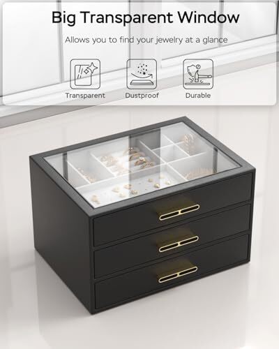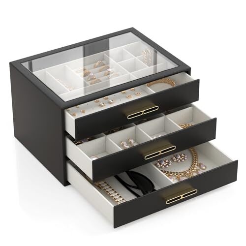 Return Policy Fast Delivery Trusted seller Jewelry Organizer with Drawer, Women & Men Jewelry Box with Glass Lid, Modern 3-Layers Case, Ideal for Necklace, Ring, Earring, Bracelet Storage, Present for Lady & Mom, 9.8x7.1x6 Inches - Black Product Description 【Clear Glass Lid】Our transparent lid design for jewelry boxes offer a dust-free, ready-to-wear display, enabling you to easily find your favorite jewelry piece at a glance without having to open the box 【3-Tier Design】This jewelry box keeps all your jewelry neatly organized, with designated slots for smaller pieces on the top tier and two drawers for larger jewelry at the bottom, providing ample storage space and ensuring effortless access 【Sturdy Electroplated Hardware】Equipped with electroplated hardware, including hinges and latches, our women&mens jewelry box offers secure closure and easy opening. The electroplated finish adds a touch of elegance while ensuring durability and resistance to corrosion 【Versatile Use】Enhance your storage solutions with this sleek and modern jewelry holder! Display it on your bedroom dresser or in your entryway closet to effortlessly organize pins, necklaces, rings, bracelets, and all your favorite accessories. Ideal for any lifestyle, this must-have organizer will keep your jewelry collection looking its best! Ultimate Present Idea: This one-of-a-kind jewlery organizer is the perfect gift for your special someone on their birthday or anniversary and Christmas , Valentine's Day, or Mother's Day; Alternatively, spoil yourself with this elegant jewelry box—you've earned it! Shipping Returns Payment Shipping Shipping is FREE to all addresses other than APO/PO boxes in the lower 48 states. All our stock ships from US-based warehouses. Shipped via USPS or UPS (depending on location and package weight) Unless stated otherwise, all orders will ship within 24-72 hours of your payment being processed. Check our feedback to see the great reviews of FAST shipping we offer. Returns Seller does not accept returns Payment We currently accept payment via eBay managed payments only. Once payment is cleared, we will dispatch your shipment within 1-3 business days. Please refer to the "Shipping" tab for more information regarding shipping speed to your destination.