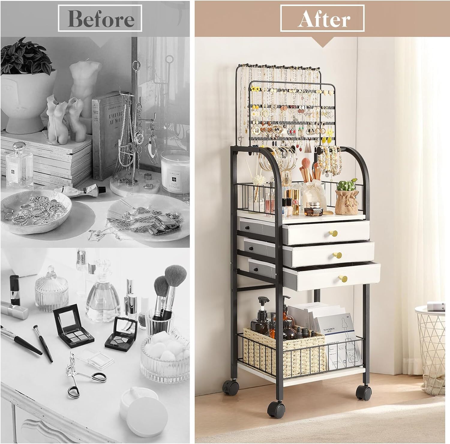 About this item Jewelry Organizer Stand Gifts for Women: This exquisite, large-capacity jewelry organizer stand is very in line with women's aesthetic preferences. Our designers design according to the needs of women, which can store all kinds of commonly used jewelry and sunglasses. Be the finishing touch of your home life, a perfect gift for your daughter, girlfriend, wife, or mother on Valentine's Day, Mother's Day, Birthday, Christmas, and many other festivals Material Upgrade Jewelry Holder: Strong and stable metal structure body and high-quality wood. Using a better material necklace holder, the earring holder helps keep jewelry hanging safely, perfect for storing and organizing earrings, necklaces, rings, bracelets, and more. There are also three drawers with a non-woven design, which is more secure to protect your jewelry from damage Use Multi-situational Jewelry Organizer: Pure white is matched with low-saturation primary-color wood panels, and the entire jewelry holder has a very fresh and simple style. It is suitable for matching various decoration styles, can be placed in various places of the home, and can be used in multiple scenes. With its own wheels, it can also be moved freely to a place where you can easily pick up your jewelry, which is convenient for you to access Creative Jewelry Stand: We is an independent design company with the goal of making products that meet market demand, making our products more practical, and maximizing the use of space. Therefore, we have designed this creative jewelry organizer for women's preferences. This jewelry display holder can store all kinds of jewelry while storing all kinds of hair accessories, head accessories, and commonly used skin care products. Give full play to the maximum utilization value of the product 3-IN-1 Jewelry Organizer: Our jewelry organizer combines a necklace holder, earring holder, shelf, and drawer with multiple storage options. It meets the storage needs of different products and comes with a ring organizer to give your jewelry and skin care products a safe and comfortable home. It can also display your jewelry better so that you can have a clear view when you are looking for the jewelry you need to match today, giving you the most satisfying experience of using it Material Metal Style Modern Special Feature Necklace Holder Recommended Uses For Product Necklace, Bracelet, Ring, Earring Product Dimensions 11.02"D x 13.07"W x 38.98"H Target Audience Women Shape Rectangular