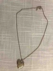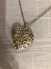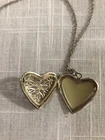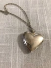 This pre-owned jewelry piece features a heart-shaped silvertone locket hanging from an 18-inch chain. The locket serves as a charming pendant and symbolizes love, making it a fitting accessory for various occasions. The classic locket design adds a touch of elegance to the overall style, making it a timeless piece to wear and cherish. Star design in heart.