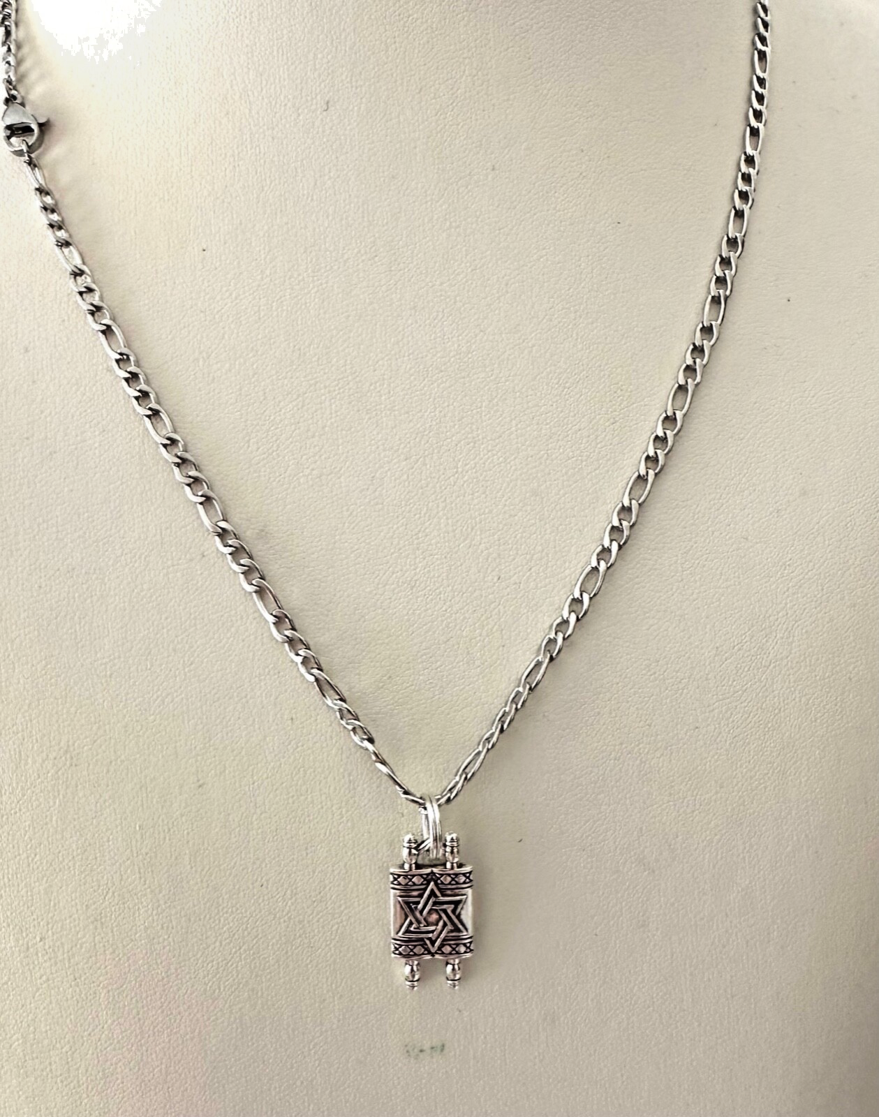 7 14 25. Beautiful-Petit-Sefer Torah Necklace with chain as shown in photos. Economically priced. Free freight-USA stock. More details to follow. Please enlarge for better view. Thank you for looking at this offer. I am happy to finally find the Sefer Torah Charm-it is double sided and has a small clear glass in the middle of the star.