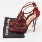 Our eBay Store About Us Contact Us Add to Favorite Sellers Jimmy Choo Burgundy Mesh and Suede Embellished Ankle Strap Sandals Size 38.5 These sandals will frame your feet in an elegant manner. Crafted from quality materials, they display a classy design and comfortable insoles. Product Details Brand Jimmy Choo Color Burgundy Includes The Luxury Closet Packaging Outsole Length 21cm Outsole Width 7.5 cm Size 38.5 Certified by The Luxury Closet This item has gone through a detailed authentication process overseen by our experts. We offer a lifetime guarantee of authenticity on all our items. How We Check The in-house team of experts at The Luxury Closet is highly trained to verify the authenticity and the condition of the luxury products. They ensure that only 100% authentic items are put on sale.The evaluation process is unique with its own mix of assessment criteria and differs according to the category. Each item is evaluated based on the following combination of hallmarks, hardware, stitching, symmetry, material, craftsmanship, stamping, codes, hologram stickers, and packaging. Our authenticators also check if the items have been modified or amended (e.g., aftermarket diamonds, replaced batteries, repaired bags, etc.) International Buyers Import duties, taxes and charges are not included in the item price. These charges are the buyers responsibility. Please check with your country’s customs office to determine what these additional cost will be prior to buying.