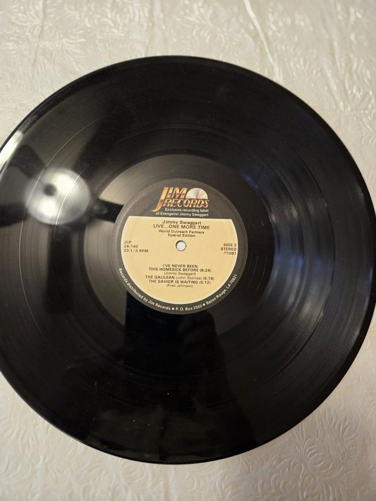 The product is a 1981 live recording on vinyl of Jimmy Swaggart's "One More Time" album, pressed at 33 RPM on Jim Records. The LP comes in a cardboard sleeve with a black color and features high-fidelity sound quality. The album showcases Swaggart's gospel and Christian music style, performed in English with a recorder instrument. The record is in excellent condition, with a near mint sleeve, and is an original pressing from the United States in stereo format. A vinyl sleeve encases this album to enhance and protect the beauty of the album and the near mint cardboard sleeve.