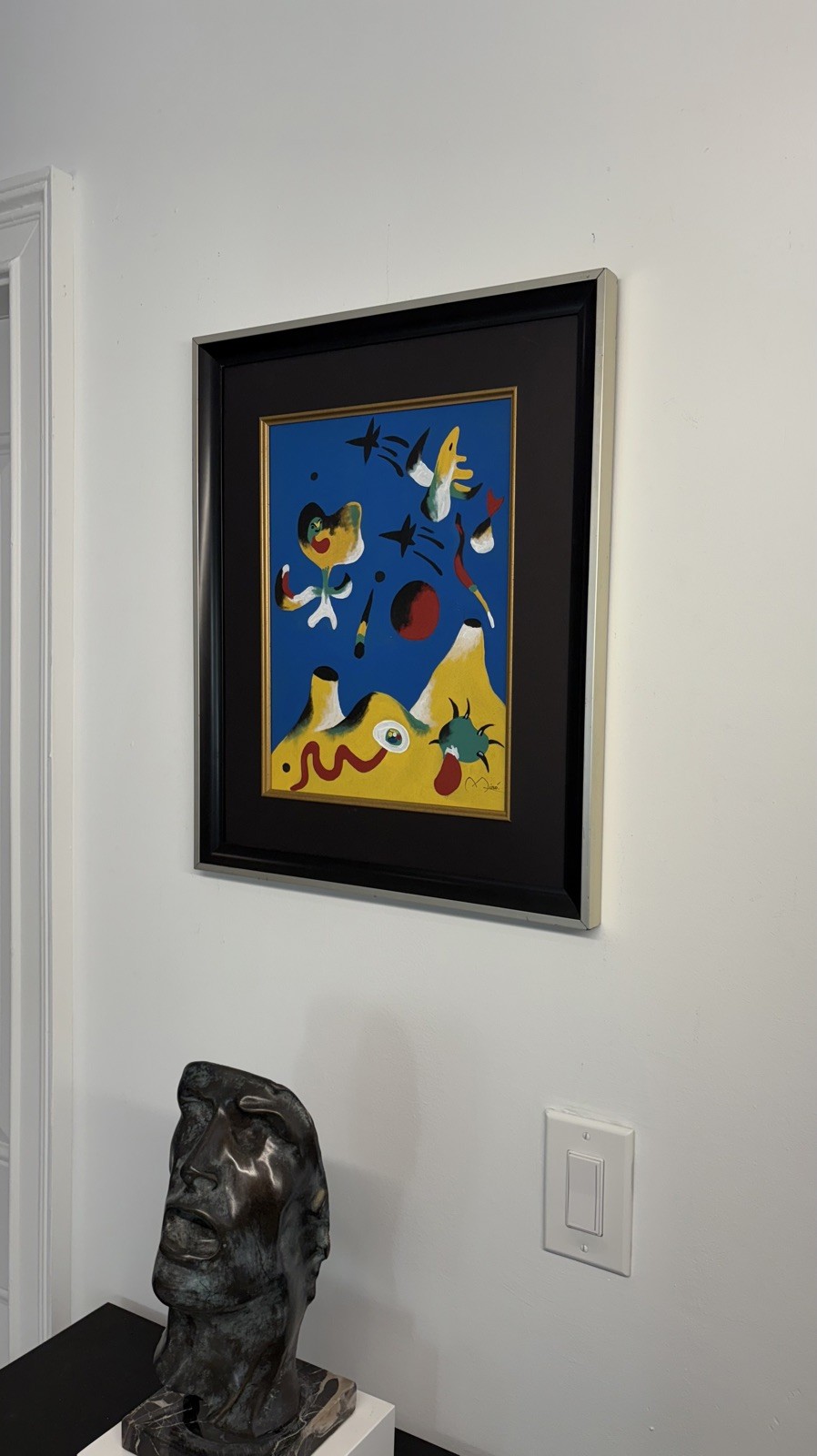 Joan Miro appears in Lower right . Attribute / in the style of Joan Miro this is not a print, is a unique piece. Technique: Mixed Media Medium: paper. Provenance: Private Collection. Lived between (April 1893 - December 1983) Joan Miro was a Spanish painter, sculptor and ceramicist born in Barcelona. Inspired by Fauve and Cubist exhibitions in Barcelona and abroad, Miro was drawn towards the arts community that was gathering in Montparnasse and in 1920 moved to Paris but continued to spend his summers in Catalonia. The artwork is framed Overall condition good, frame does have some scratch’s. Measurements: Image 13 3/4 x 10 3/4 Framed 20 1/2 x 17