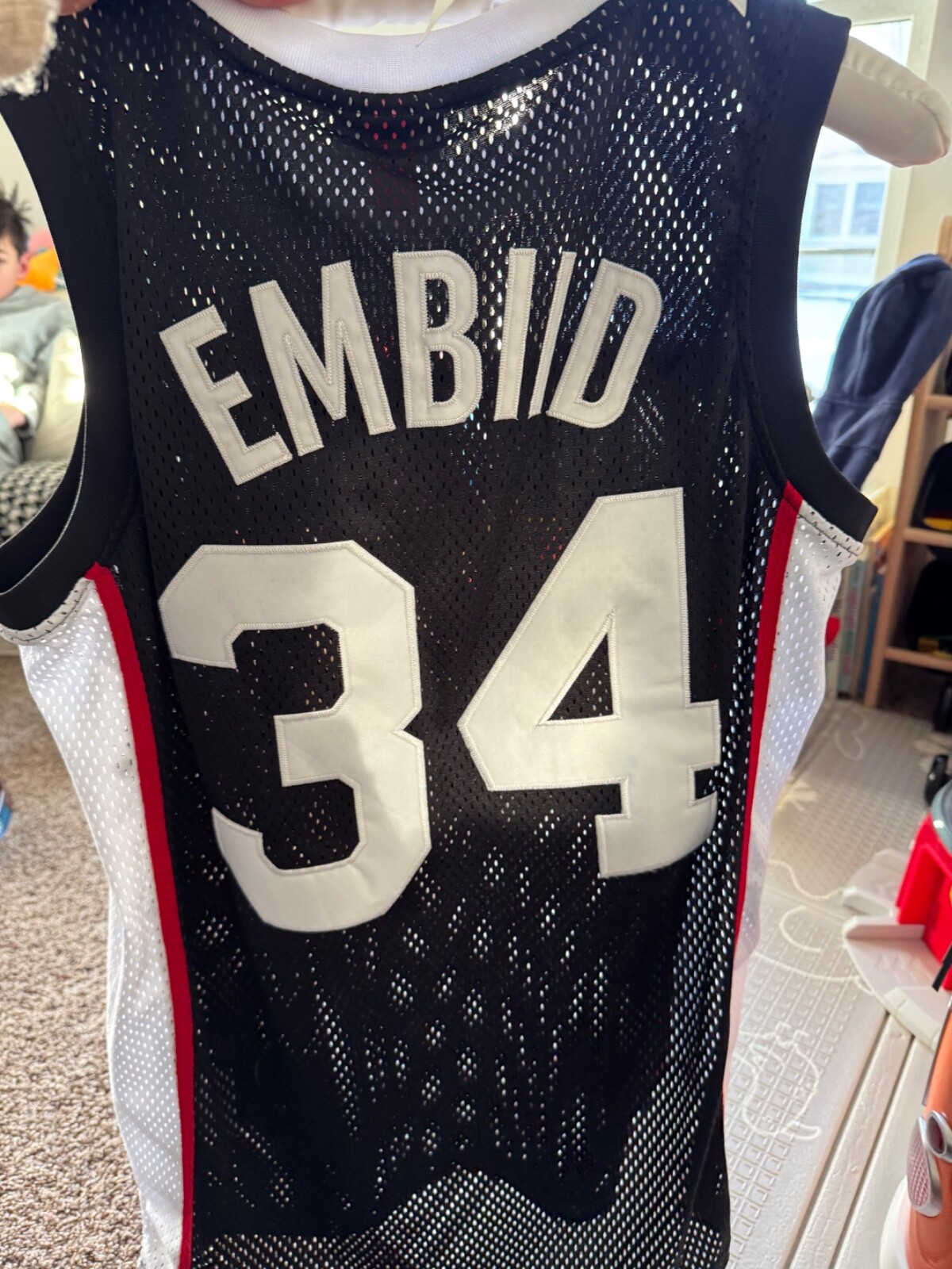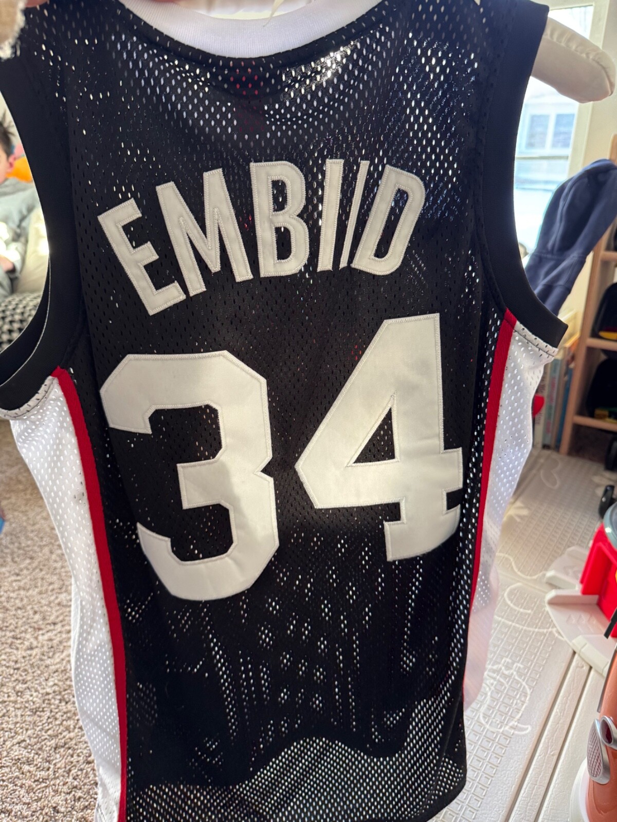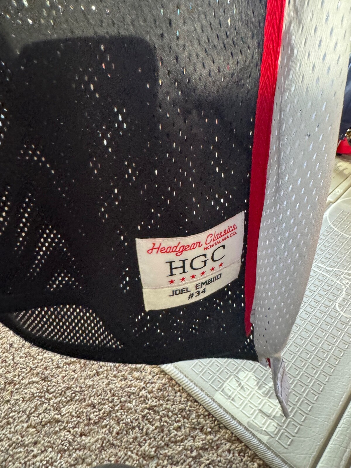 Embrace your hoop spirit with the Joel Embiid #34 The Rock High School Basketball Jersey by Headgear. This medium-sized men's jersey boasts a sleek black design, capturing the essence of the NBA star's dynamic presence on the court. Whether you're playing a game or cheering from the sidelines, this jersey is a testament to your dedication to the sport and your favorite player. Crafted with quality fabrics, the jersey ensures comfort and durability, allowing you to perform at your best or showcase your fan pride at the next basketball event. With its authentic design and vibrant colors, this piece of fan apparel is a must-have for any basketball enthusiast or collector of NBA memorabilia.