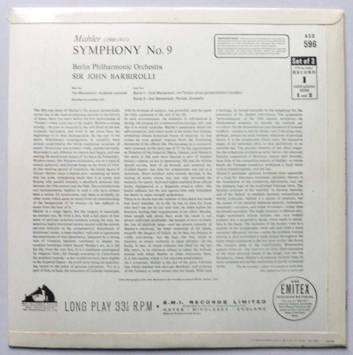 Item Description John Barbirolli Mahler Symphony No 9 2LP HMV ASD596-ASDS597 EX+/EX 1964 three-side double LP in separate sleeves - semi circle labels - there are very occasional ticks - 3 or 4 each side not loud - side 3 has three repetitive ticks which are much fainter Artist: John Barbirolli Title/Tracks: Mahler Symphony No 9 Format: 2LP Label/Catalogue No: HMV ASD596-ASDS597 Record Grading: EX+ Sleeve Grading: EX Release Date: 1964 Notes: three-side double LP in separate sleeves - semi circle labels - there are very occasional ticks - 3 or 4 each side not loud - side 3 has three repetitive ticks which are much fainter Shipping We offer free UK postage using Royal Mail 48 which includes a tracking number to provide proof of delivery. We use custom-made mailers to ensure safe transit. Records are removed from original sleeves to prevent seam splits. All records are supplied with a 400g polythene sleeve. Overseas shipping is by standard untracked Airmail and normally takes 2-7 days (Europe) or 5-10 days (Outside Europe). Or you can select tracked Airmail from the drop down menu at checkout. This costs a little more but a good idea for high value items or high risk destinations. About Us Jeff & Catherine run thespacebar records. We have over 25 years experience selling vinyl online and thousands of happy buyers. We have total integrity & 100% commitment to customer satisfaction. Buy your vinyl with confidence here... At thespacebar.records we have been selling vinyl online since 1999. We don’t use stock photos. What you see is what you get. If we do have multiple copies we’ll send the best one. If there are any issues when we come to pack up your record we message to let you know and wait for you to confirm prior to shipping. Much of our stock is near-perfect. We grade conservatively. Many items are unplayed . We’re always adding more photos to our listings. In the meantime if you’d more images of an item please send a message. In the item titles we grade the vinyl 1st and the sleeve (if applicable) 2nd. We sell some records without sleeves and some sleeves without records. We always check that buyer has understood this before posting these items. Singles without a picture sleeve are supplied in an original company sleeve where possible. Otherwise they are sent in a new plain white sleeve. All records are supplied with a 400g poly-sleeve for protection. Everything is pressed in the UK unless otherwise stated in the item description. More information/track listings/photographs available on request. Enjoy browsing our site. Jeff & Catherine