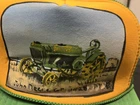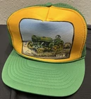 This RARE vintage John Deere Nissin snapback features custom artwork of a 1928 tractor, signed by RJ. The hat is a 1992 original, made in Taiwan. It is a great addition to any collector's advertising or John Deere memorabilia collection. The hat is in good condition and would make a great gift for anyone who loves agriculture or vintage items. Preowned and good condition. Hat does show some coloration on inside band and on the foam on the inner part of the hat from age. This is the real deal and has held up very nicely for its age. Artist signed.