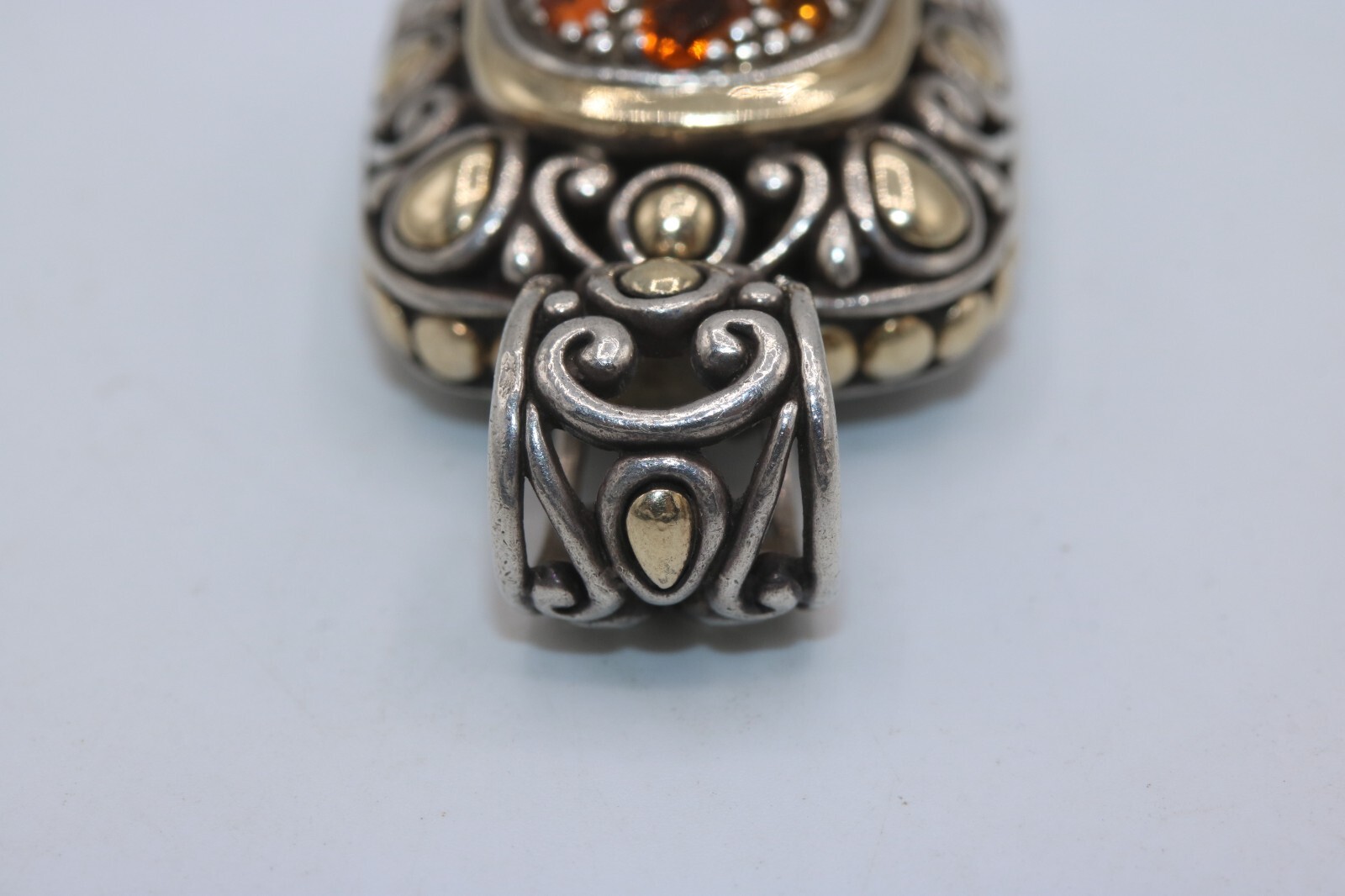 John Hardy 925 Sterling Silver 18K Gold Citrine Cluster Batu Slide Pendant Metal: Sterling Silver / 18K Yellow Gold Weight: 16.4 Grams Stones: Citrine (different shades) Measurement: Pendant is 1.4" long x 0.8" wide. Bale fits up to a 6mm chain. Hallmarks: "JH 925 18K" Should you have any further questions please feel free to e-mail. Thank you!