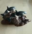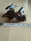 John Perry Pair of Orca Whales on Drift Wood Sculpture 2017 *** Please look over all photos provided and buy at your own discretion. The dorsal fins show signs of wear. ***