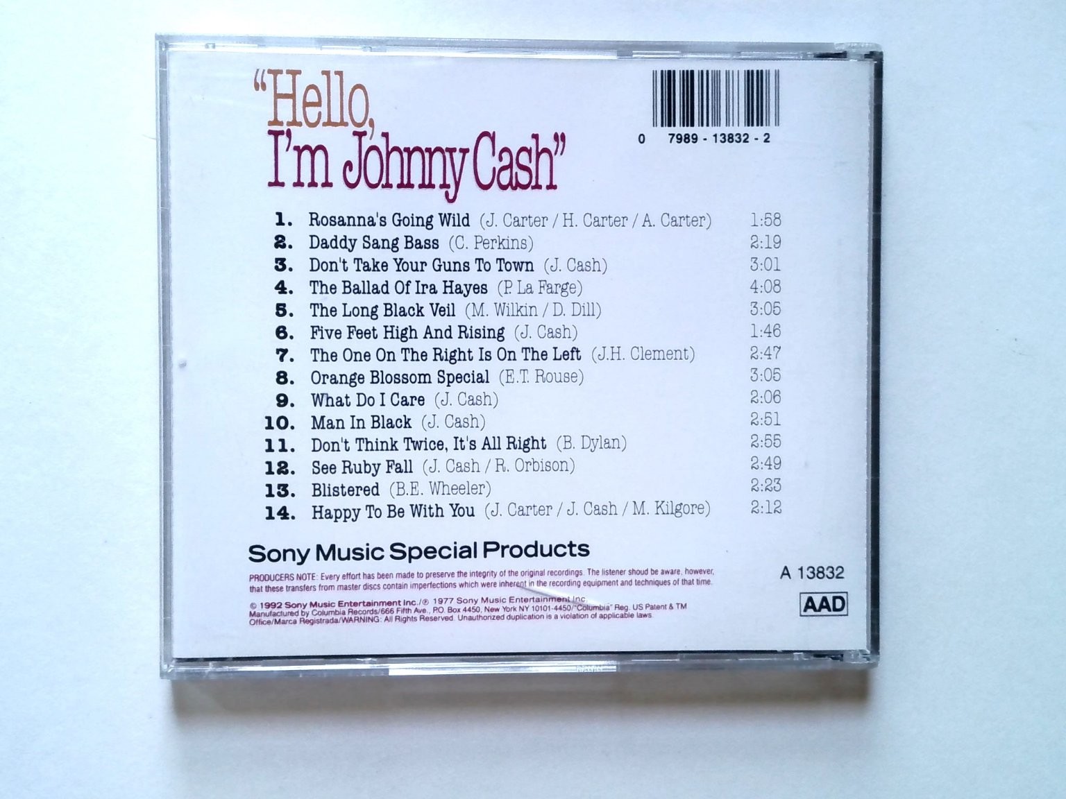 Experience the timeless country sound of Johnny Cash with the CD "Hello, I'm Johnny Cash." This compilation features 14 classic tracks including fan favorites like "Man In Black," "Don't Take Your Guns To Town," "Orange Blossom Special," and "The Ballad Of Ira Hayes." Originally recorded in 1977 and reissued in 1992 by Sony Music Special Products, this CD offers a superb collection of Cash's storytelling and iconic voice, digitally mastered from analog recordings. This edition is manufactured by Columbia Records and carries the catalog number A 13832. The disc presents high-quality audio (AAD) and comes in a standard jewel case with a full tracklist on the back cover. Perfect for collectors and fans of classic country music, this release captures the spirit and legacy of one of America's greatest musicians. Cracks to CD case. Used CD with light scuffs that does not effect playback. Case has some scuffs and age wear. Insert in nice shape.