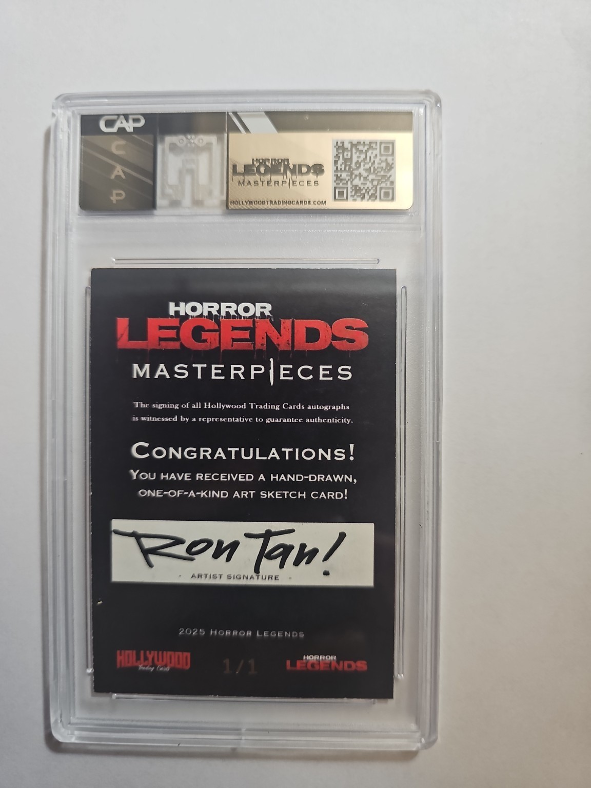 You are purchasing an authentic one-of-a-kind Jon Abrahams signed sketch card from the 2025 Horror Legends Masterpieces series. This card features a full-color original artwork by Ron Tan depicting Jon Abrahams alongside a horror character, hand-signed by Abrahams on the front of the card. The card is serial numbered 1/1, making this the only copy in existence. Encapsulated and certified by CAP (Certified Authentic Products) for authenticity and protection. Card Details • Actor: Jon Abrahams • Set: 2025 Horror Legends Masterpieces • Card Type: Hand-drawn original sketch • Serial Number: 1/1 • Artist: Ron Tan • Authentication: CAP slabbed • Condition: Encapsulated, near mint or better