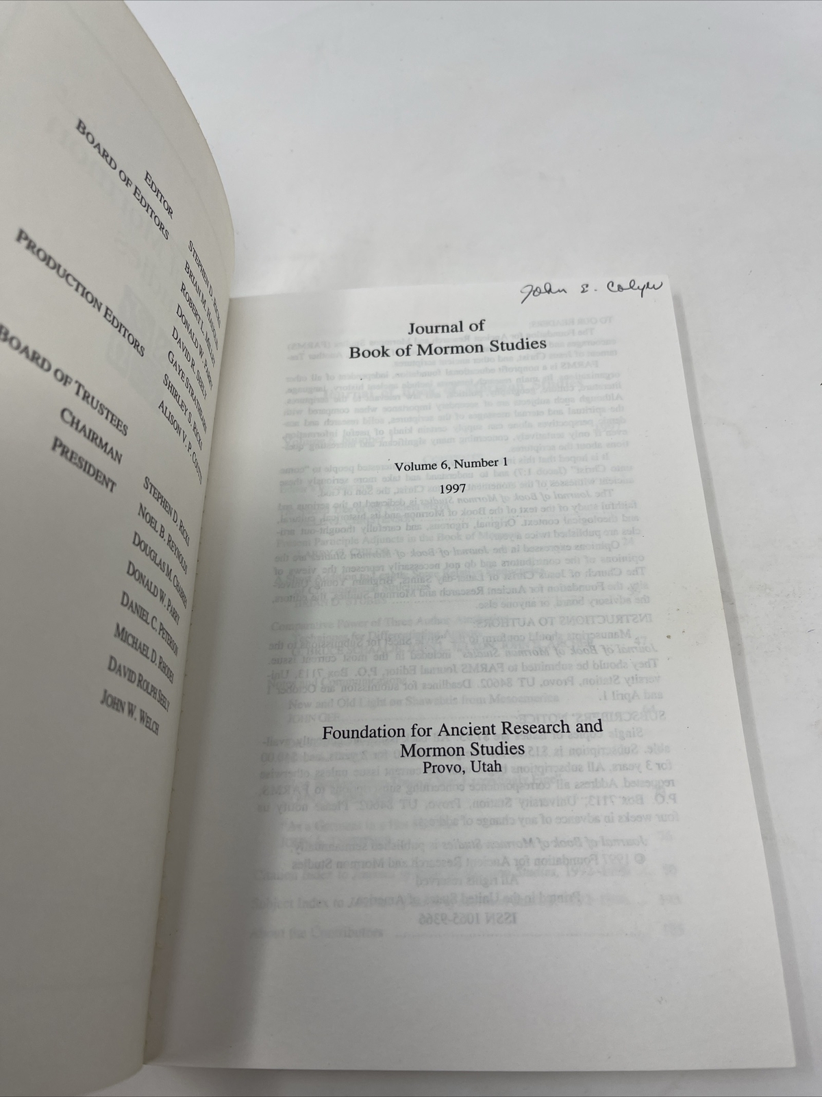 Journal of Book of Mormon Studies, Volume 6, Number 1, 1997 - LDS, FARMS 3b15 The "Journal of Book of Mormon Studies, Volume 6 Number 1," published in the 1997 by the Foundation for Ancient Research and Mormon Studies (FARMS), likely contains a collection of scholarly articles and research papers focused on various aspects of the Book of Mormon. As an academic publication dedicated to the study of the Book of Mormon, this journal likely features contributions from scholars and experts in fields such as history, archaeology, linguistics, and religious studies. The articles may cover a wide range of topics related to the Book of Mormon, including its historical context, textual analysis, cultural background, and theological significance. Readers can expect to find in-depth analyses, critical examinations, and new insights into the Book of Mormon text and its interpretation. The journal likely aims to foster scholarly dialogue, promote academic rigor, and contribute to a deeper understanding of the Book of Mormon within the broader context of religious studies and Mormon scholarship. Overall, "Journal of Book of Mormon Studies, Volume 6 Number 1" serves as a valuable resource for academics, researchers, and individuals interested in the study of the Book of Mormon and its significance within the Latter-day Saint tradition. Item Specific Notes: - Book is in really nice condition. - Some minimal writing in margins or underlining noted on a few pages. - See pictures for condition of book. - General statement on used books we sell. All books are in acceptable pre-owned condition with possible cosmetic issues. Please refer to photos for condition. Smoke free home. Due to its age, it may contain imperfections such as marks, notations, marginalia and flawed pages, flawed book binding. Hyrum’s Rare Books: We actively sell as well as purchase Latter-day Saint books, other religious or interesting books, historical artifacts, documents, and other hard to find items. Our core is rare Latter-day Saint (LDS) or Mormon books. Terms: All orders ship within two business days. Standard mail is USPS Media Mail. We offer combined shipping on multiple orders, please message to give a head’s up as to additional shipping on your part, and to have an updated invoice created when finished to reflect combined shipping pricing.