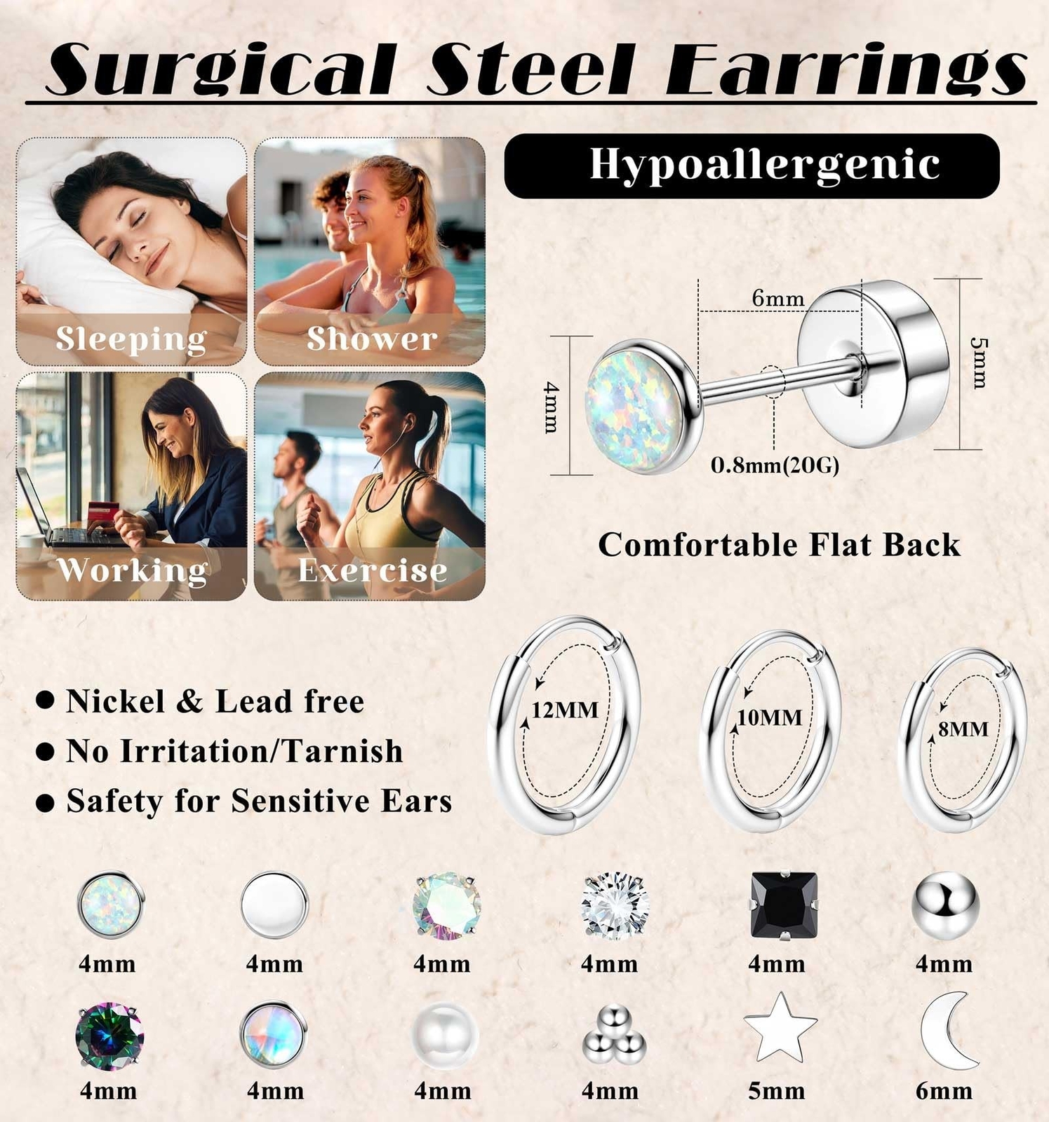 $ 9.03Pairs 20G Surgical Steel Threadless Studs Earrings Push in Flat Back Earring...