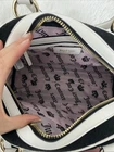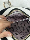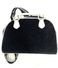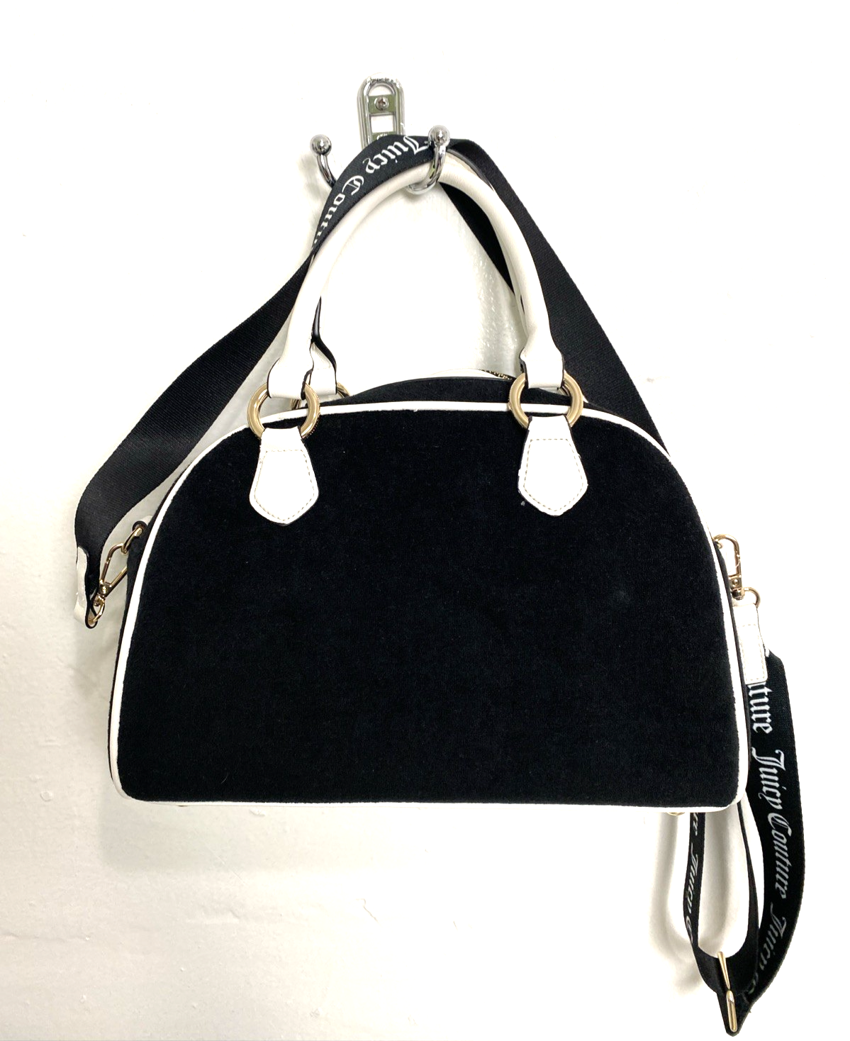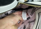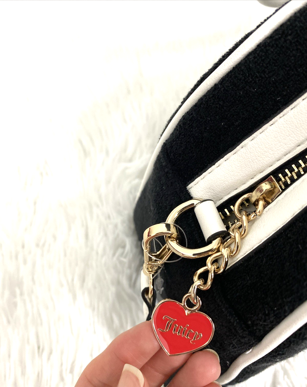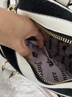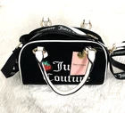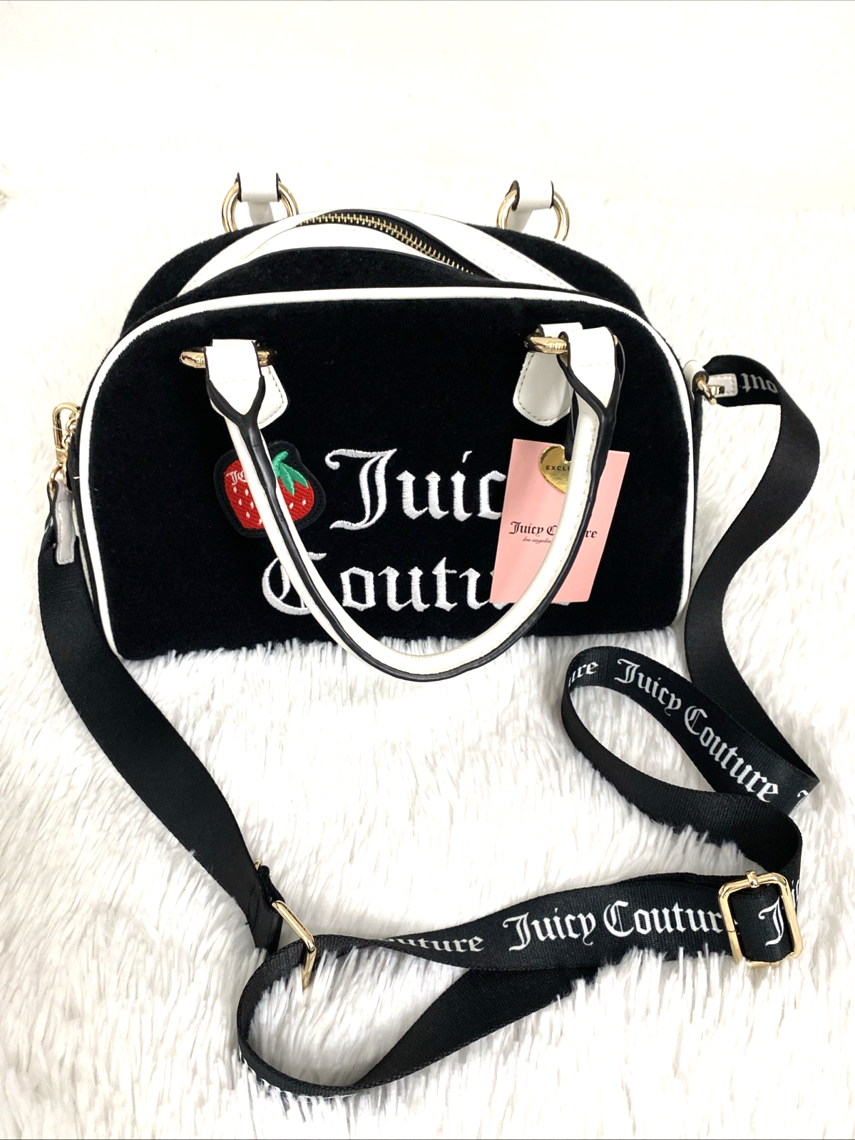 Juicy Couture Sweet N Juicy Apple Satchel Duffle Bag Terry Black Heart Charm. See pictures for more details. The Juicy Couture Sweet N Juicy Apple Satchel Duffle Bag in Terry Black with a heart charm is a stylish and versatile accessory for women. This medium-size rectangular bag features a zip closure, black handles, and gold hardware accents. The bag is perfect for various occasions such as casual outings, parties, workwear, and formal events. It also includes a detachable strap and other accessories, making it a practical and fashionable choice for everyday use. Made of terry cloth with a fabric lining, this bag embodies the designer brand's signature style with a pink lining and a strawberry character. Measurements 12x8x4.