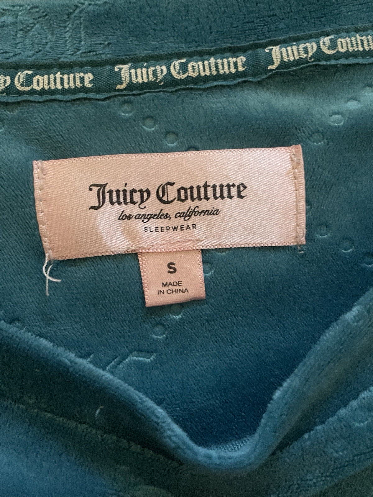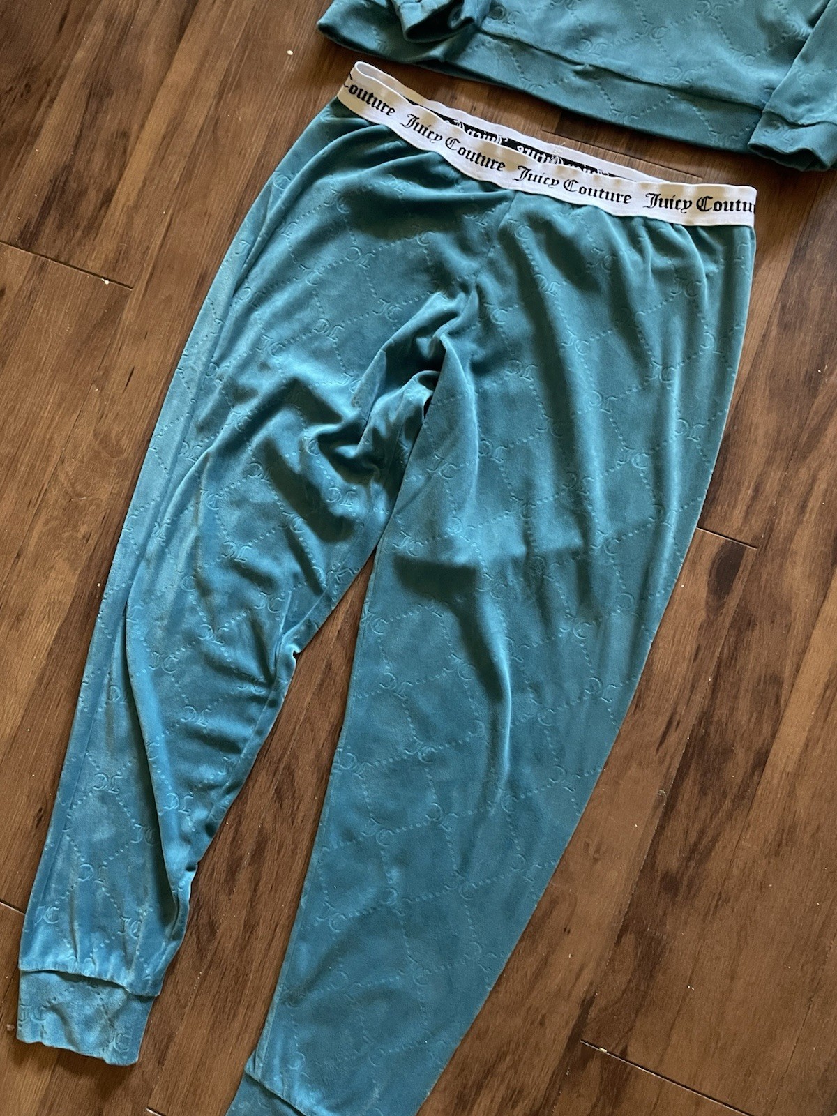 Stay cozy and stylish with this Juicy Couture velour lounge set in a beautiful teal blue color. This matching set includes a long-sleeve top and jogger-style pants featuring the signature Juicy Couture monogram pattern throughout. The pants have a comfortable elastic waistband with “Juicy Couture” branding. Details: • Brand: Juicy Couture • Color: Teal / Blue-Green • Material: Velour (soft and stretchy) • Includes: Long Sleeve Top + Jogger Pants • Pattern: All-over Juicy Couture monogram • Waistband: Elastic with Juicy Couture logo • Condition: Pre-owned, good condition (no major flaws visible; see photos)