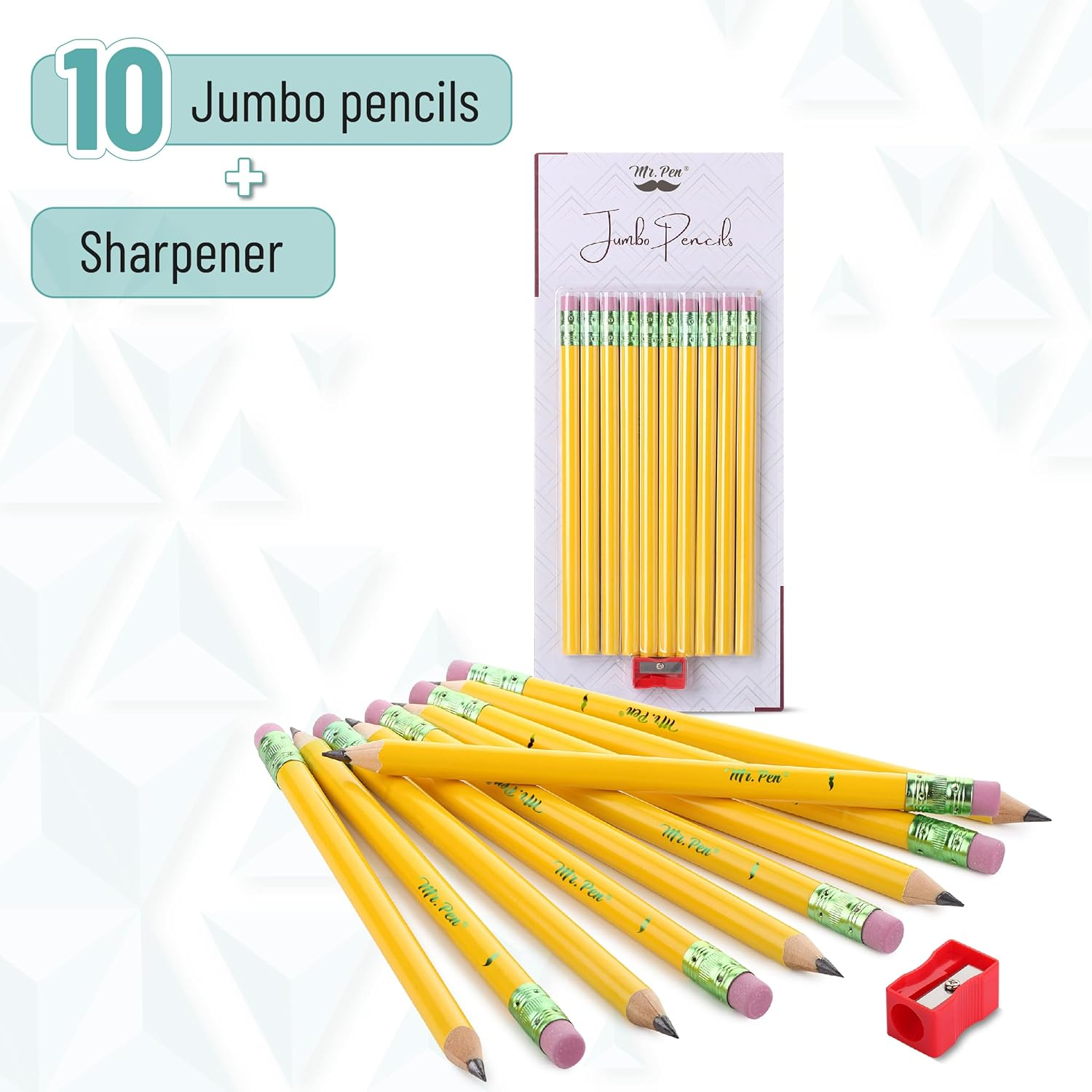 - Jumbo Pencils 10 Pencils and 1 Sharpener Big Pencil Fat Pencils Jum Package includes 10 jumbo pencils and 1 sharpener for beginners. Mr. Pen jumbo pencils are made from high-quality wood for easy sharpening. A large diameter (0.38") is ideal for children's early writing development stages. Top-quality, latex-free eraser provides easy, clean corrections. Experts agree fat pencils with soft graphite help toddlers, and preschoolers learn proper pencil grip. Product Description Mr. Pen Pencils Add to Cart Add to Cart Add to Cart Add to Cart Add to Cart Add to Cart Customer Reviews 4.7 out of 5 stars 1,411 4.5 out of 5 stars 690 4.6 out of 5 stars 550 4.8 out of 5 stars 6,464 4.6 out of 5 stars 89 4.6 out of 5 stars 6,374 4.6 out of 5 stars 6,374 Price $8.85 $ 8 . 85 — $7.99 $ 7 . 99 $5.99 $ 5 . 99 $5.85 $ 5 . 85 $4.85 $ 4 . 85 $4.99 $ 4 . 99 Quantity 10 24 12 14 24 36 36 Color Black Black Black Black Black Multicolor Multicolor Shape Round Hexagonal Hexagonal Hexagonal Round Hexagonal Round High Quality ✔ ✔ ✔ ✔ ✔ ✔ ✔ Pre-Sharpened ✘ ✔ ✔ ✔ ✘ ✔ ✔ Item model number JMB10 Closure Twist Writing Instrument Form Graphite Pencil Number of Items 10 Color Graphite Material Type Wood Line Size 1_0_1_9mm Grip Type Smooth" or "Plain Manufacturer Part Number JMB10 Item Weight 0.014 ounces Age Range (Description) Adult Ink Color Black Point Type Thick Package Dimensions 11.65 x 5.24 x 0.47 inches Size 1 Count (Pack of 10) ABOUT US We offer the best prices around on high quality products. Our Ebay store includes media such as books, movies, music and games while offering electronics, toys, sporting apparel, clothing, tools, general home, garden items and more. SHIPPING We are always working hard to ensure your package arrives as soon as possible. Please understand that some factors like weather, high postal traffic, and the performance of shipping companies are outside of our control. We offer free shipping to the lower 48 states and ship within 2 business days of payment, usually sooner. We do not accept P.O. Boxes. Please provide a physical address. RETURNS We offer a 30-Day Return Policy on items which you are not completely satisfied with. You have the option for a full refund or an exchange of the item. No returns are available on items shipped outside of the USA. CUSTOMER SATISFACTION We try our very best to make sure every customer is completely satisfied. If there's a problem, message us! We're happy to help.