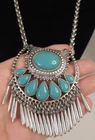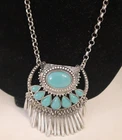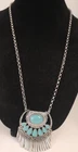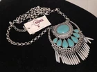This is a Just Jewelry New Boho Chic Faux Turquoise and Silver Fringed Pendant Necklace. The necklace has a 32 inch length and features a dream catcher theme. The pendant is a tassel style with a lobster closure. The main stone is a turquoise color and the material is feather. The necklace is signed by the brand Just Jewelry.