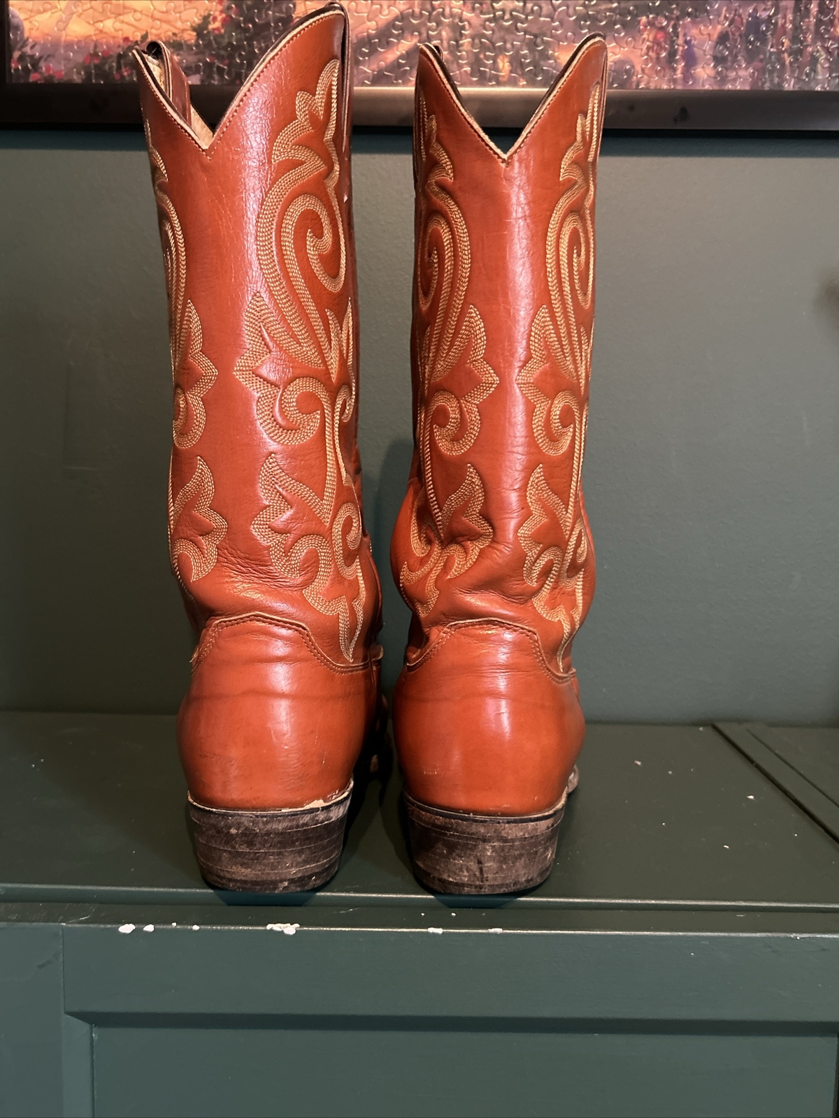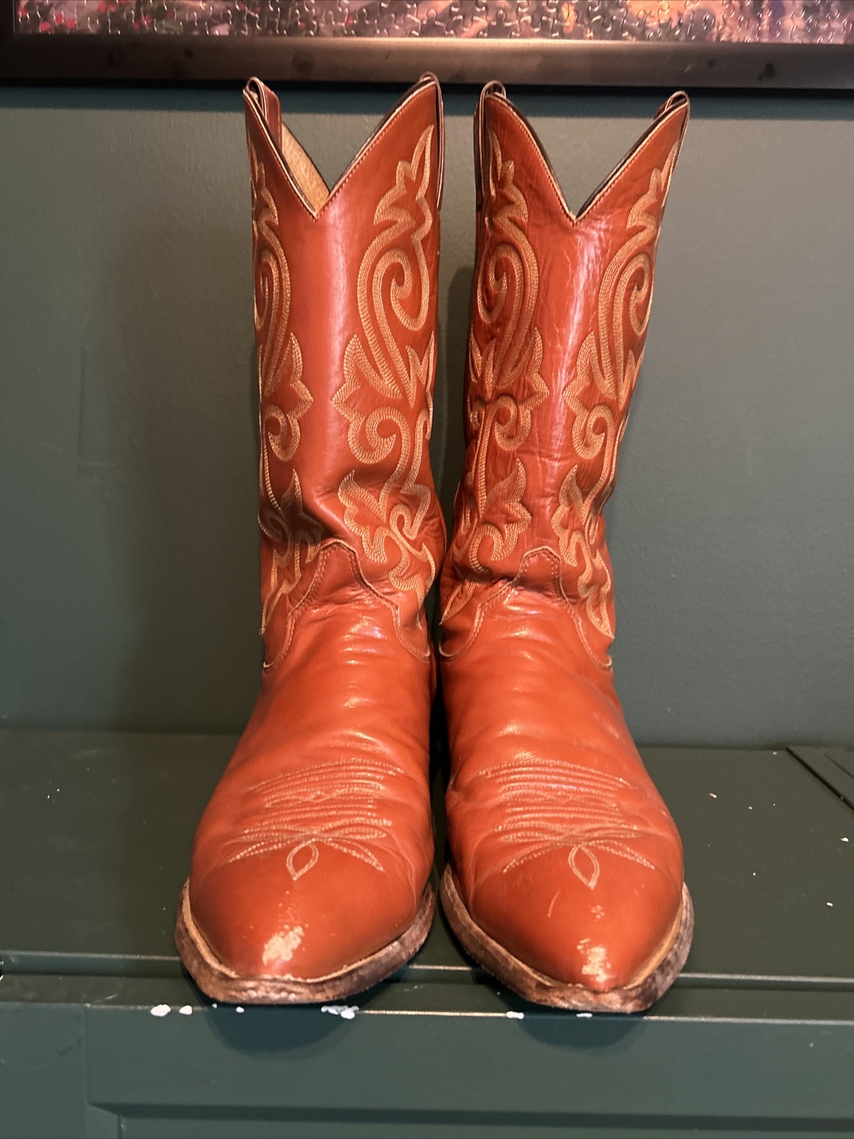 Justin Brown Leather Cowboy Western Boots, Style 1483, are a men's size 9.5EE. These boots feature a pointed toe shape and a leather upper and outsole material. They are designed for activewear, casual, and business occasions. The boots are part of the Justin Boots product line and have a Western cowboy theme.