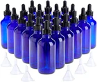 Crystal Clear Dropper Bottles: Your Essential Oil Storage Solution! 🌟 These beautiful glass bottles are perfect for storing your favorite essential oils, perfumes, or hair serums. 💧 The black dropper lids create a tight seal, so you can use them over and over again without worrying about leaks. ✅ Each bottle measures 1.9 x 1.9 x 5.5 inches and holds 4 ounces (120ml) of liquid. ♻️ Made from high-quality glass, these bottles are easy to clean and reuse. ✨ This set includes 24 blue glass bottles with droppers and 6 funnels for easy filling. Organize your beauty routine with these stylish and functional dropper bottles!
