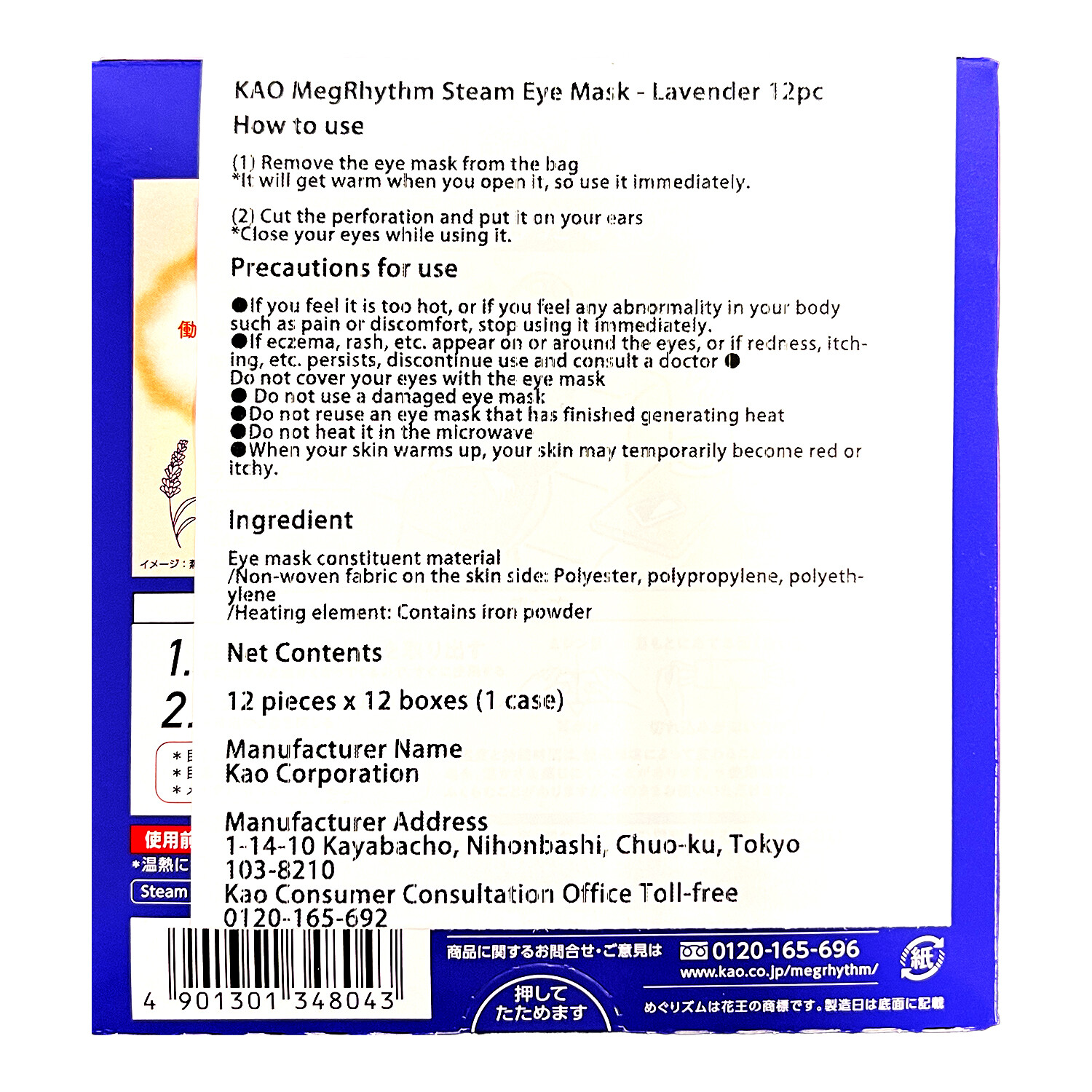KAO MegRhythm Steam Eye Mask - Lavender 12pc KAO MegRhythm Steam Eye Mask - Lavender 12pc An innovative self-warming Steam Eye Mask developed with Japans unique and innovative steam heat technology. The abundance of comfortable 40C steam heat produced gently envelopes your eyes to relieve and relax strained eyes and ease away tensions to soothe your stressful moods. Enjoy a higher level of relaxation and comfort with the improved MegRhythm Steam Eye Mask! Unique steam heat technology to extend the comfort duration by 2 times to 20 minutes. Improved ear strap fit for a wider spread of warmth around the eyes. Lavender Variant. 12pc Made in Japan Product Details Brand KAO Size 12 Count (Pack of 1) Manufacturer KAO Product Type Eye Masks Mpn 22860 Comfort time has doubled (about 20 minutes) 40 C gently wraps important eyes and eyes Check out my other items.