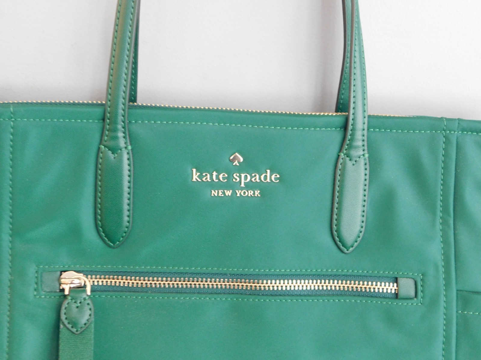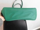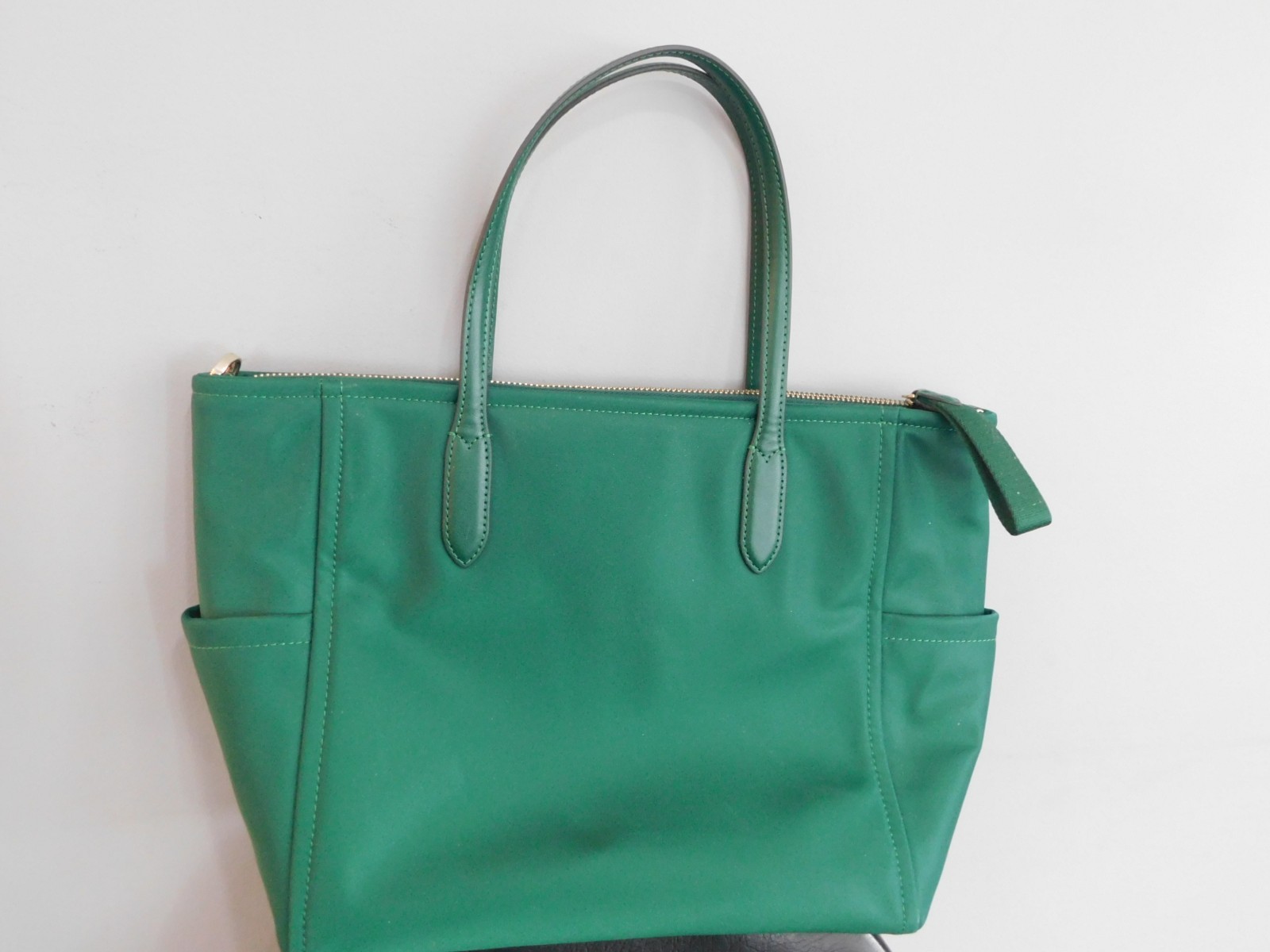 Listed is a great looking women's designer hand bag, created by Kate Spade of New York. The bag is about 2 years old and has never been used. It is in new condition, immaculately clean. The bag is a bright dark green with gold zipper accents and lettering. It is a medium size with a gold zipper top for closure, two top handles and inside pockets on both sides. The interior is a matching darker green with the classic Kate Spade logo print. As mentioned, the purse is in perfect condition inside/outside and ready to use for a Spring accessory.