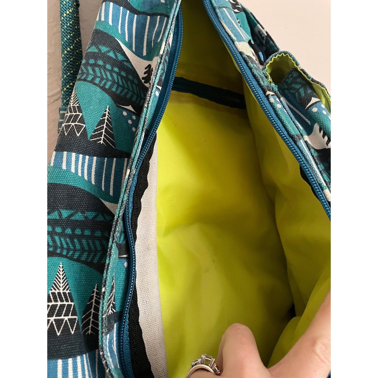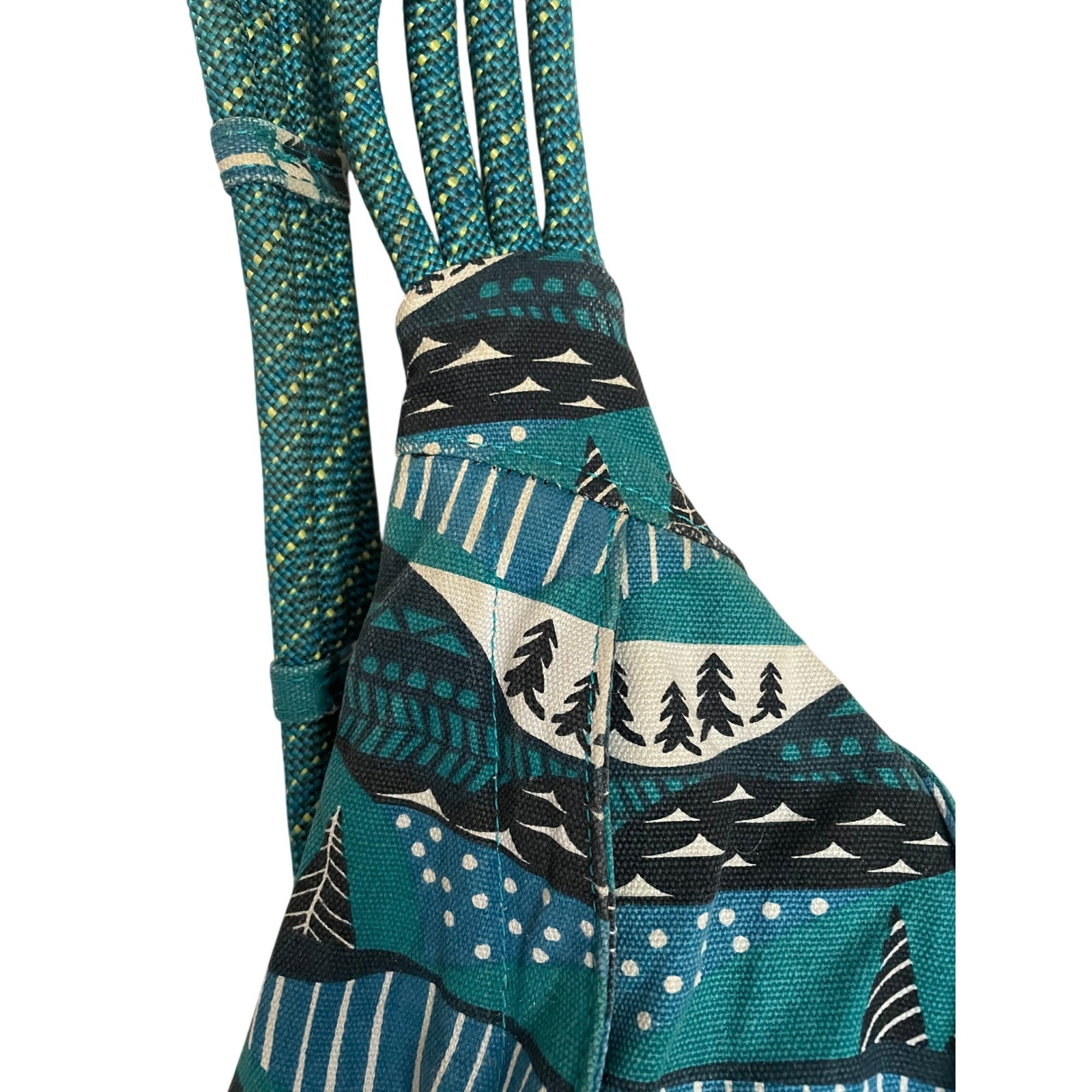 Pockets, Adjustable, Back Pack, Hiking, Walking, Camping, Travel, Gorpcore, granola Exterior Material: Cotton Style: Sling Bag Exterior Color: Jade Green, Blue, Black, White, yellow Department: Unisex Adults Lining Color: Yellow Handle/Strap Material: Nylon Handle/Strap Color: Blue Lining Material: Fabric Hardware Color: Black, Silver Closure: Zip, Buckle Keywords: KAVU bag, sling pack, mountain print, tree motif, rope strap, travel, outdoor, casual, everyday, compact, unisex, festival, daypack Measurements: Width: 11" Length: 19" Flaws: Some color fading and discoloration as pictured From Pet Friendly Smoker Free Home
