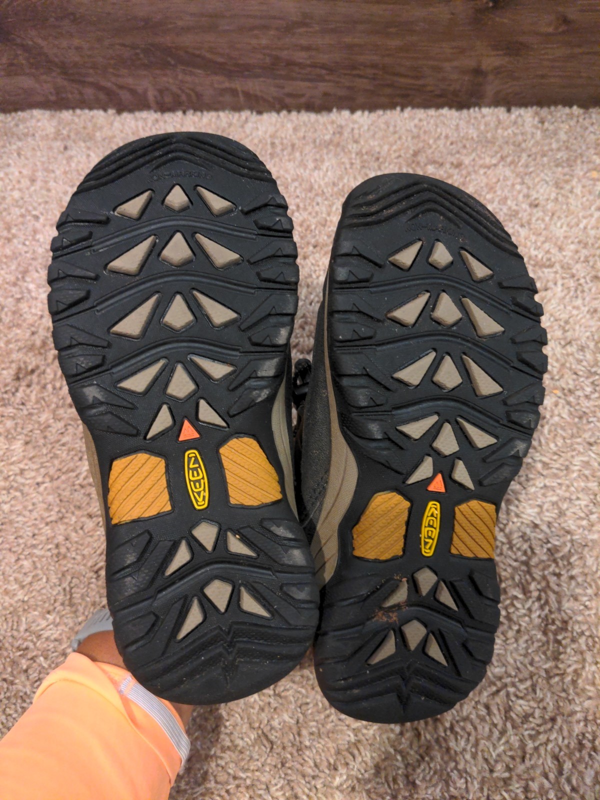 KEEN kids size 13 brown and black hiking boots. Practically new with almost no wear. Velcro strap to secure drawstring Bungie tie for stress free dressing. Waterproof! Smoke free home.