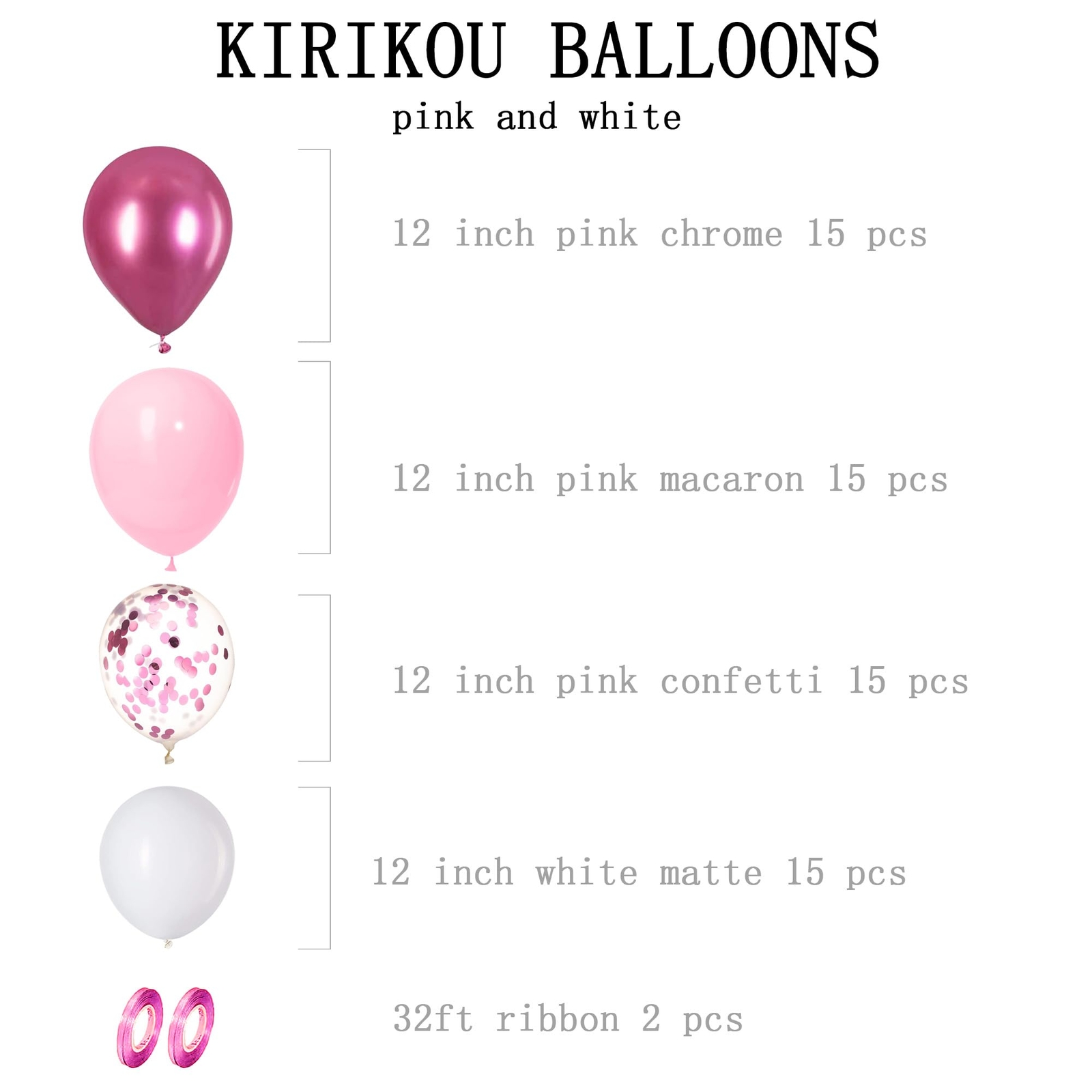 KIRIKOU 12 Inch 60 Pack Metallic Pink and White Confetti Balloons Garland Arch Kit Chrome Shinny Pastel Macaron Balloons with Ribbons for Wedding Baby Shower Graduation Birthday Party Decorations What You Get? 60 pcs balloons: 12 inch chrome pink balloons 15 pcs, 12 inch pink confetti balloons 15 pcs, 12 inch macaron pink balloons 15 pcs, 12 inch white balloons 15 pcs, pink balloon ribbon 1 reel, white balloon ribbon 1 reel. Premium Quality - High-quality and eco-friendly chrome latex balloons with confetti balloons made of 100% eco-friendly llatex, non-toxic and odorless, 100% be safe for kids. They are much more durable than regular bloons, which can remain a good shape for a long time after inflation. How to Make Confetti Balloon - After inflating the balloons, rub the surface of the balloons on carpet or with a dry towel to help the confetti stick to the balloons. And it is recommended to use a pump to quickly inflate so that confetti will be easer to be stuck. Or spray a little water into the ballons before inflating. Perfect Party Decorations - Beautiful KIRIKOU balloon garland arch kit to make your party elegant and romantic, which is perfect for New year, Engagement, Graduation, Wedding party, Christmas party, birthday party,and other party decorations. SERVICE: We do our best to provide customers with better products. If you have any questions, we promise to give you a satisfactory answer without any delay. What You Get? 60 pcs balloons: 12 inch chrome pink balloons 15 pcs, 12 inch pink confetti balloons 15 pcs, 12 inch macaron pink balloons 15 pcs, 12 inch white balloons 15 pcs, pink balloon ribbon 1 reel, white balloon ribbon 1 reel. Premium Quality - High-quality and eco-friendly chrome latex balloons with confetti balloons made of 100% eco-friendly llatex, non-toxic and odorless, 100% be safe for kids. They are much more durable than regular bloons, which can remain a good shape for a long time after inflation. How to Make Confetti Balloon - After inflating the balloons, rub the surface of the balloons on carpet or with a dry towel to help the confetti stick to the balloons. And it is recommended to use a pump to quickly inflate so that confetti will be easer to be stuck. Or spray a little water into the ballons before inflating. Perfect Party Decorations - Beautiful KIRIKOU balloon garland arch kit to make your party elegant and romantic, which is perfect for New year, Engagement, Graduation, Wedding party, Christmas party, birthday party,and other party decorations. SERVICE: We do our best to provide customers with better products. If you have any questions, we promise to give you a satisfactory answer without any delay. Shipping from the USA All of our products are shipped from the USA, ensuring quick delivery to your destination. Payment We offer the following payment methods: PayPal, credit card, bank transfer, and eBay's secure payment system. Free Shipping & Free Returns Shipping within the USA is FREE. Additionally, any return is absolutely free for you. Risk-Free Purchase You have the option to return an item within 30 days without any justification. We cover the return shipping costs! Fast Shipping We ship immediately upon receipt of payment. Generally, the package is delivered within 2-3 days in the USA. If it takes longer, we will contact you. Quality and Costs Made in Europe, USA, China No customs fees or additional charges Total satisfaction guarantee Invoice with declared VAT available upon request in .pdf format Feedback Your feedback is very important to us. After you pay for your purchase, you will automatically receive positive feedback from us.