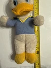 This is a vintage Donald Duck plush toy from the 1970s, standing at 12 inches tall. The toy is made of a soft, stuffed material and features the classic orange and yellow feathers. It is a great addition to any Disney or plush toy collection.