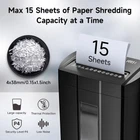 15-SHEET CROSS-CUT SHREDDER: This cross-cut shredder works by shredding up to 15 sheets at a time, and can shred both without removing staples. In addition to shredding paper and staples, this shredder can also shred credit cards/CDs/DVDs. Please note, please do not throw paper clips into the shredder, they cannot be shredded. ULTRA-SECURE SHREDDING: Our heavy-duty shredders shred paper into 4x38mm/0.15x1.5inches cross-cut particles for enhanced security; P-4 security level, ideal for handling highly confidential documents. SAFETY PROTECTION & CONVENIENT DESIGN: Our home office Cross Cut automatically activate overheat and overload protection when overloaded, and the machine will automatically stop operating. This paper shredder is designed with 3 mode control switches (Auto, Off, Reverse). In the event of a paper jam, press the "REV" button to quickly release the jam. EXTRA LARGE WASTE BIN & ≤50DB LOW NOISE: Ideal for use at home or in the office, this portable paper shredder features an extra-large 18L/3.7 Gallons waste bin. Additionally, the office shredder features a low noise design with ≤50dB to keep the room quiet. 30/50 MINUTES CONTINUOUS RUNNING TIME: Our auto feed cross cut shredders can run for up to 30/50 minutes before needing to cool down, which means you can get multiple shredding jobs done in a single sit-down session!