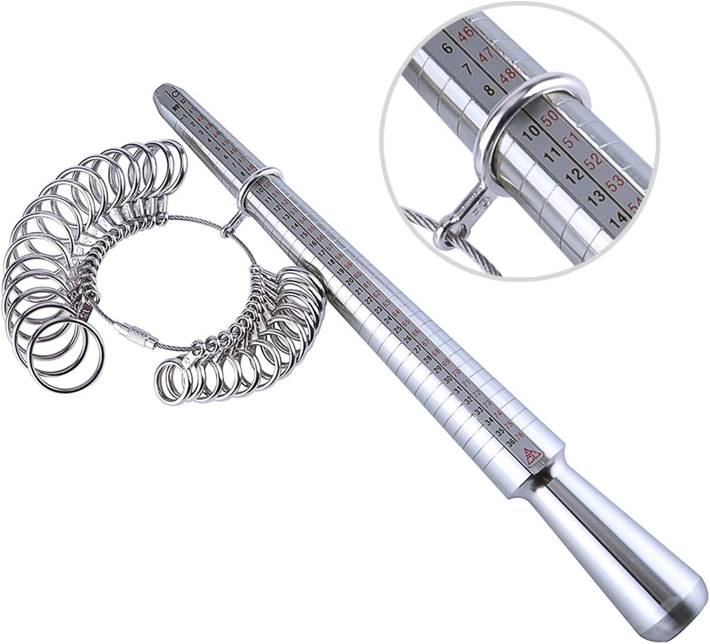 KUUQA Metal Ring Mandrel Ring Sizer and Rubber Hammer Mallet Ring Sizer Gauge Set with 2 Piece Jewelry Polishing Cloths Product Details Product Dimensions: 4.06 x 2.32 x 0.62 inches Item model number: A3023KQJYB Is Discontinued By Manufacturer: No Item Weight: 15.5 ounces Manufacturer: KUUQA Package included: 1 * ring mandrel; 1 * ring sizer; 1* rubber jewelers hammer; 2 * polishing cloths. Ring sizer measuring tools Aluminium ring mandrel stick sizer fits for US sizes of 1 - 15 and European sizes of 41 – 76 Ring sizer gauges includes 27 pieces, US ring sizes of 0 - 13, comes in half sizes (the negative number means half size), no quarter sizes The rubber hammer can be used to fix or adjust rings or other jewelry, rubber head will not leave traces on the jewelry or damage your jewelry These jewelry making tools set is necessary tools you need, great for craft wire, wire working and jewelry, whether you are a beginner or a professional