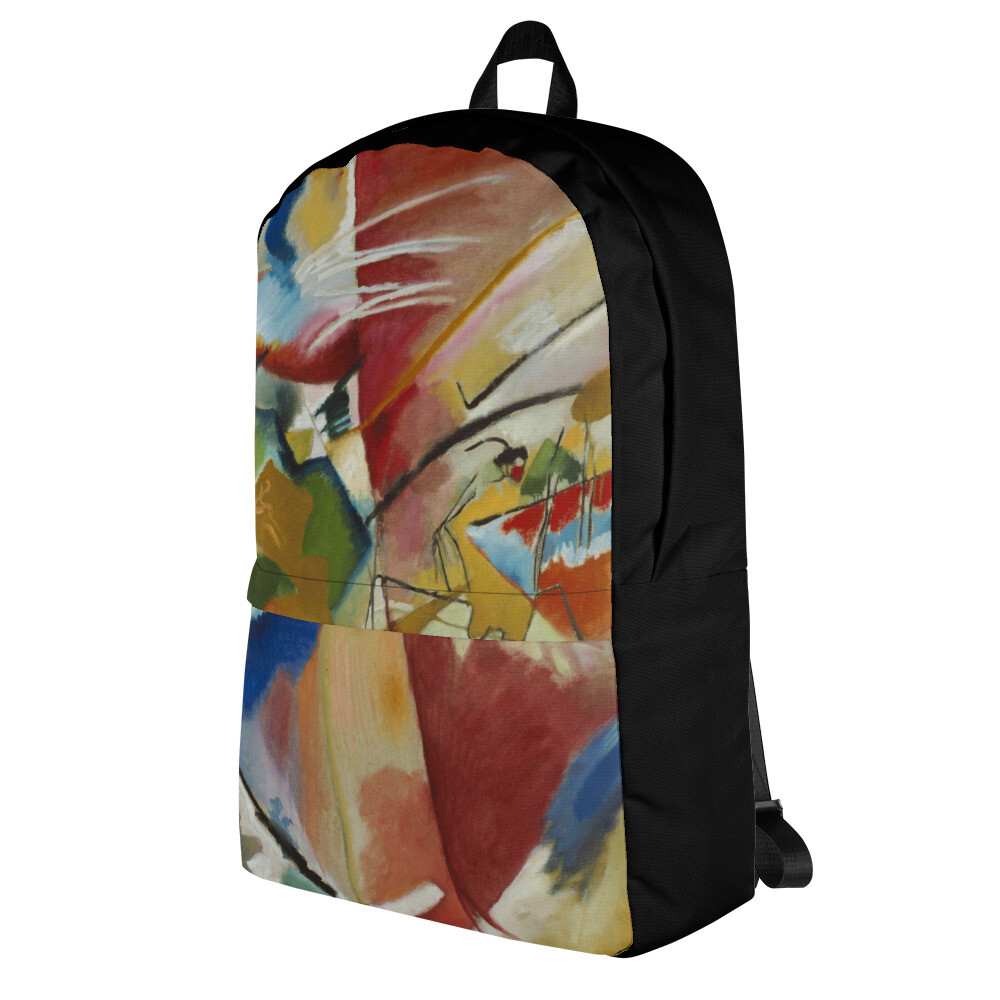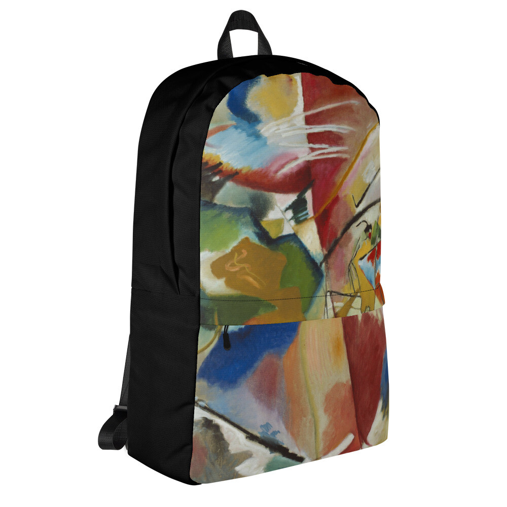 Image: Vasily Kandinsky - Painting with Green Center - 1866–1944 - The Art Institute of Chicago This medium size backpack is just what you need for daily use or sports activities! The pockets (including one for your laptop) give plenty of room for all your necessities, while the water-resistant material will protect them from the weather. • Made from 100% polyester • Dimensions: H 16⅞" (42cm), W 12¼" (31cm), D 3⅞" (10cm) • 9.56 oz/yd² (325 g/m²), weight may vary by 5% • Maximum weight limit: 44lbs (20kg) • Water-resistant material • Large inside pocket with a separate compartment for a 15” laptop, front pocket with a zipper, and a hidden pocket with zipper on the back of the bag • Top zipper has 2 sliders with zipper pullers • Silky lining, piped inside hems, and a soft mesh back • Padded ergonomic bag straps from polyester with plastic strap regulators • Blank product components sourced from China