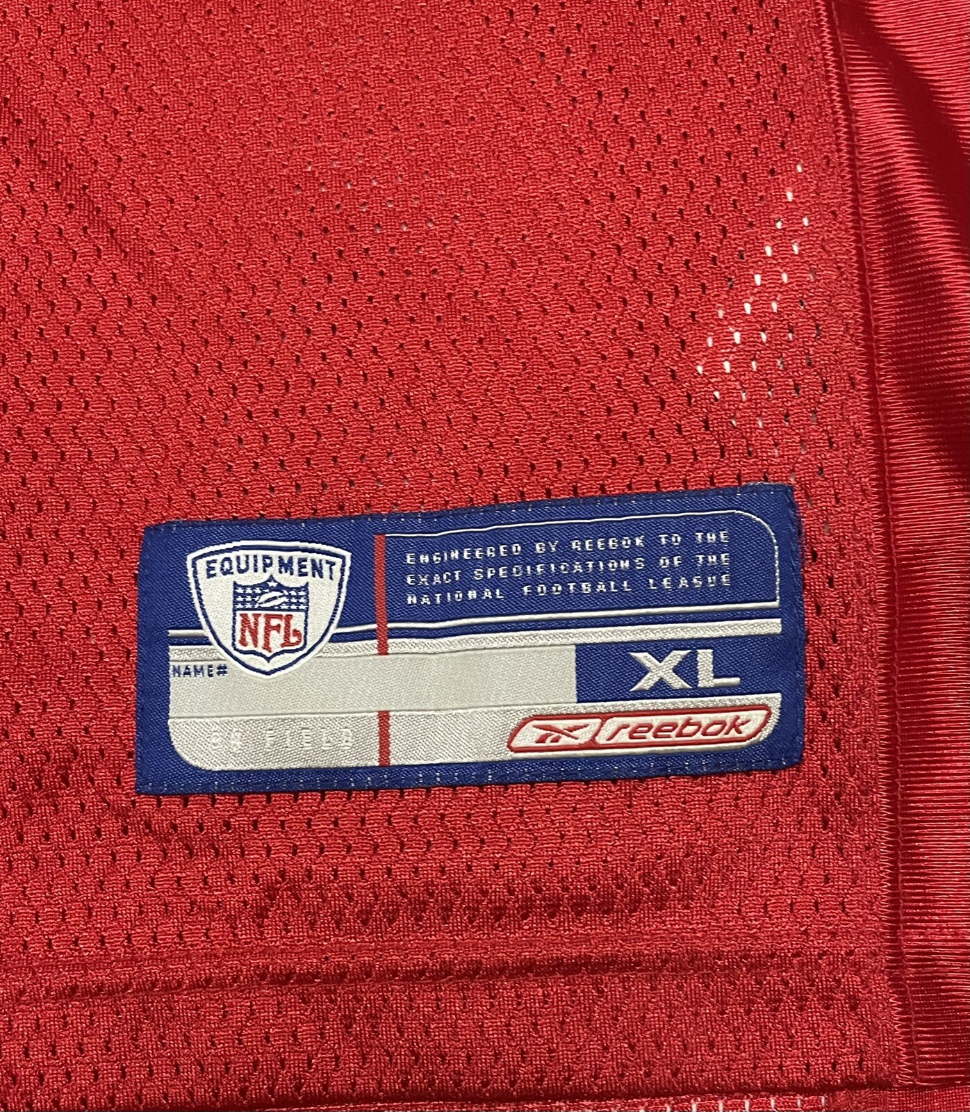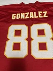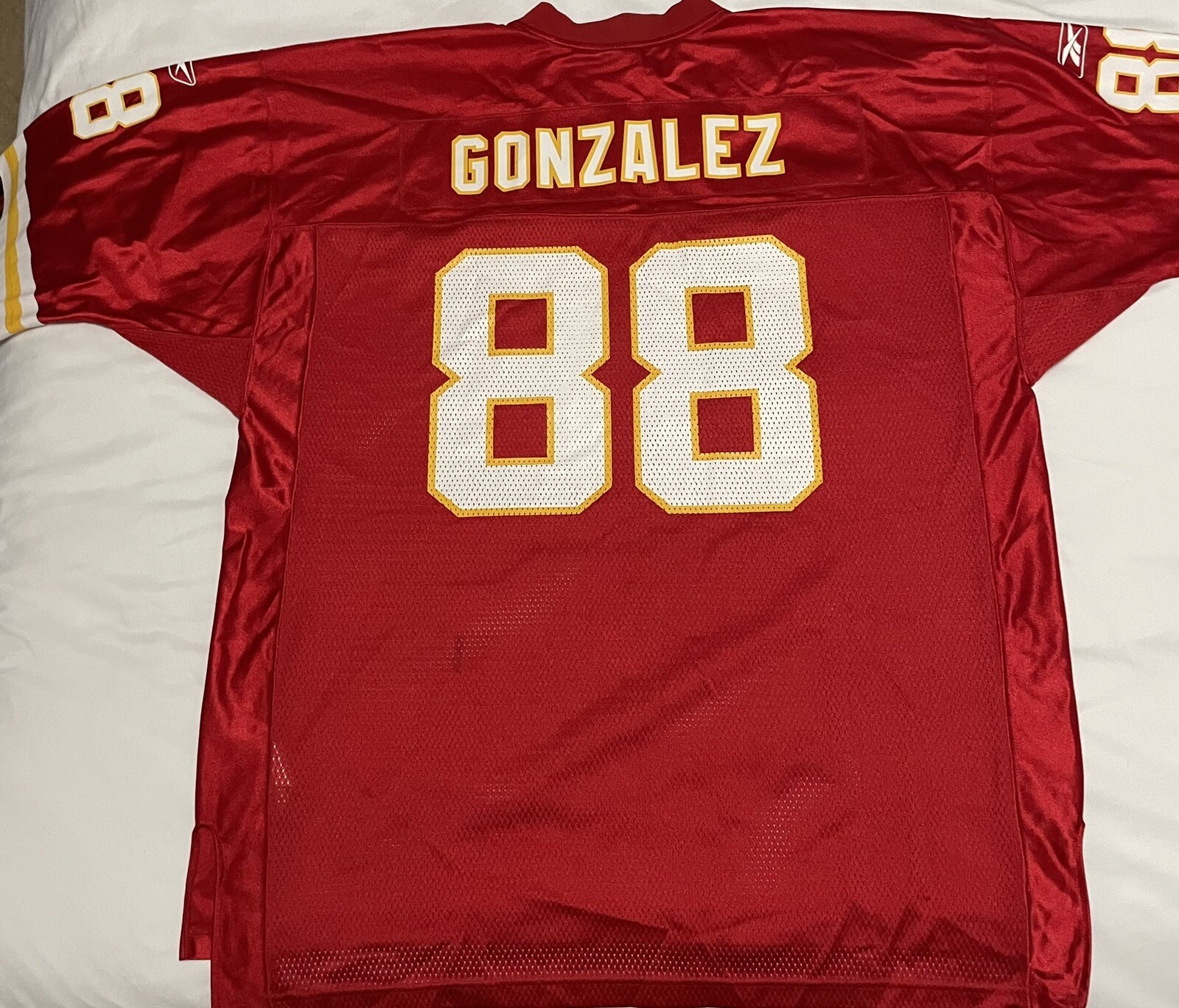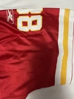 The product is a Kansas City Chiefs Reebok On-Field Tony Gonzalez Jersey in size XL. It is a red jersey featuring screen printed details of the player Tony Gonzalez, who is associated with the National Football League (NFL) team Kansas City Chiefs. The jersey is officially licensed by Reebok for use in football events and tournaments, specifically for the NFL regular season. It is designed for men and is a part of fan apparel and souvenirs for fans of the Kansas City Chiefs.