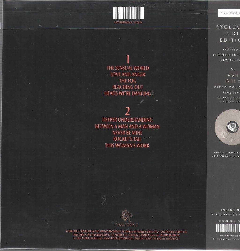 Further Details Title: The Sensual World Condition: New Format: Vinyl Edition: 12" Album Coloured Vinyl (Limited Edition) Genre: Rock No Of Discs: 1 Release Date: 11/20/2023 Color: 'Ash grey' (solid white/black) coloured vinyl. Run Time: 41.59 Record Label: Fish People Artist: Kate Bush Producer: Kate Bush Style: Singer/Songwriter EAN: 5057998201044 MPN: FP6LPX Description: Sixth studio album by the English singer-songwriter, featuring the singles 'The Sensual World', 'This Woman's Work' and 'Love and Anger'. The album was released in October 1989 and peaked at no. 2 on the UK Albums Chart. Release Year: 2023 Missing Information? Please contact us if any details are missing and where possible we will add the information to our listing.