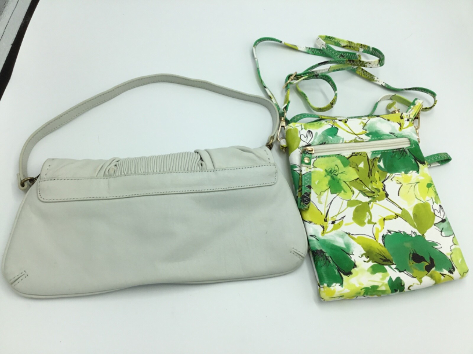 Lot of 2 cute spring/summer purses, small cream color Kate Landry clutch with removable strap, preowned. Green floral crossbody with adjustable strap, new. Thanks for looking. No international shipping.